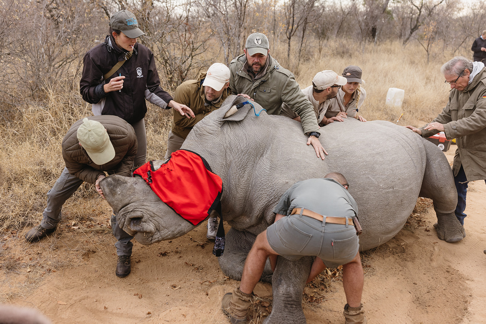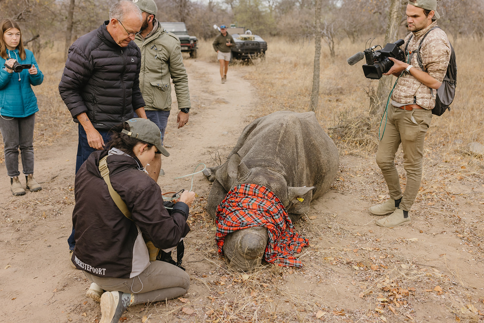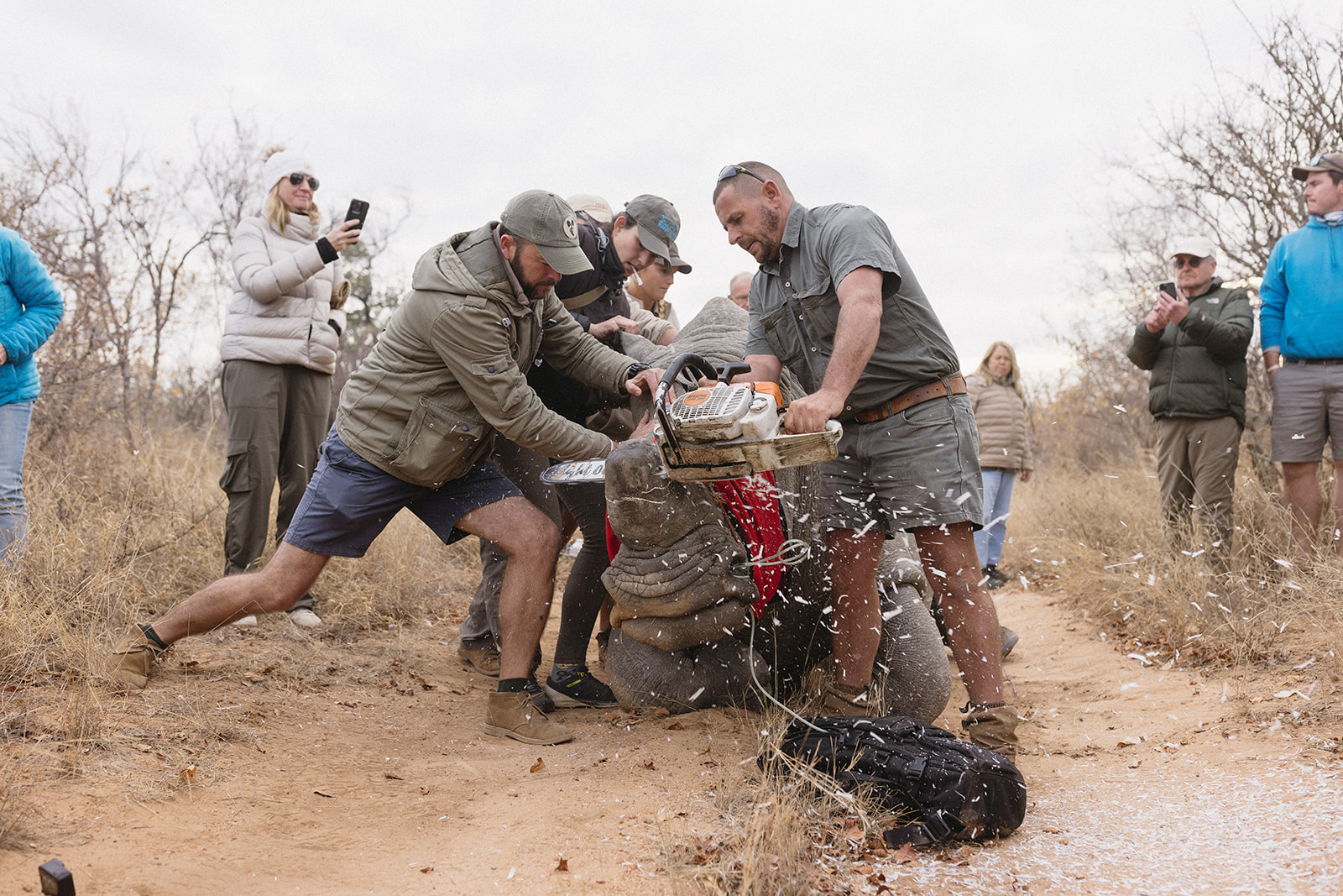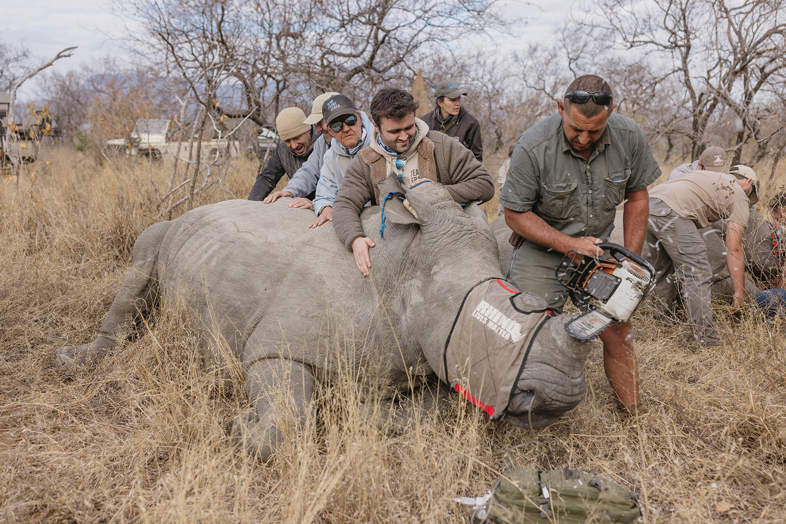 Zeitgleich mit dem Anbringen der Tracking Devices wurde bei sieben Breitmaulnashörnern ein Horntrimming durchgeführt. Diese Maßnahme verlief reibungslos und ohne Komplikationen. Alle beteiligten Tiere sind wohlauf. Das Horntrimming ist eine wichtige präventive Maßnahme, die dazu beiträgt, die Tiere vor Wilderei zu schützen.