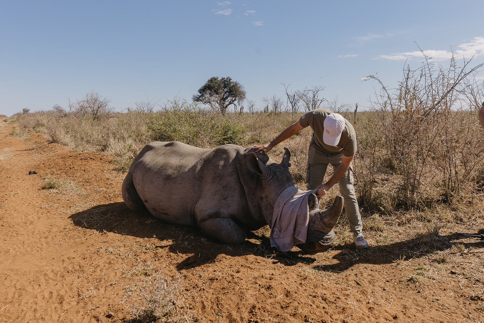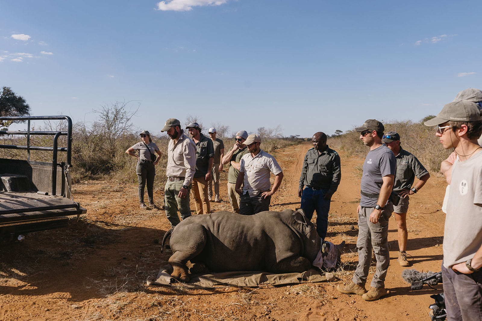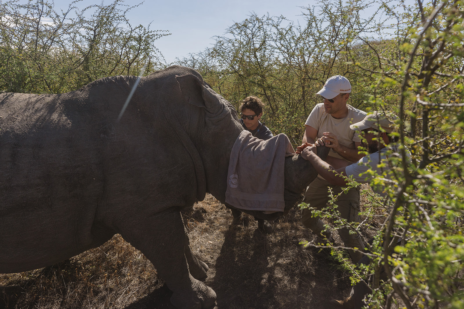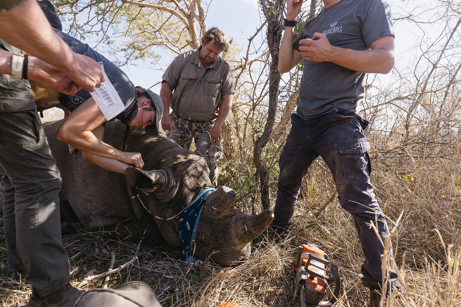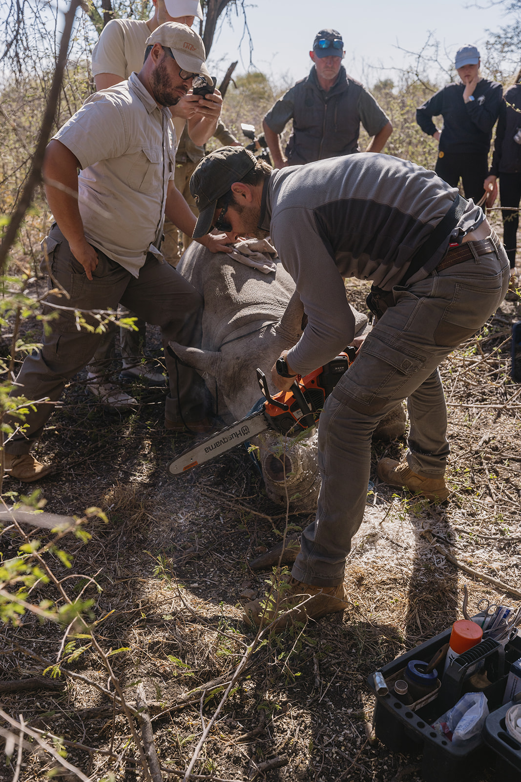 Das Team, bestehend aus zwei erfahrenen Wildtierärzten und einer Assistenz, wurde von den Helfern von Rhino Revolution sowie freiwilligen Helfern und der Leitung des Reservats unterstützt. Neben der körperlich anspruchsvollen Arbeit stellte das dicht mit Dornen bewachsene Reservat eine weitere Herausforderung dar. Schweres Equipment wie Kettensägen und 25-Liter-Wasserkanister, um die Tiere vor Überhitzung zu schützen, musste über hunderte Meter getragen werden.