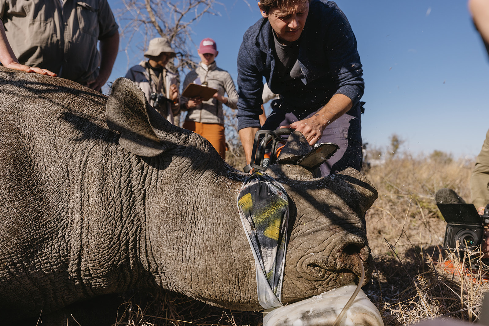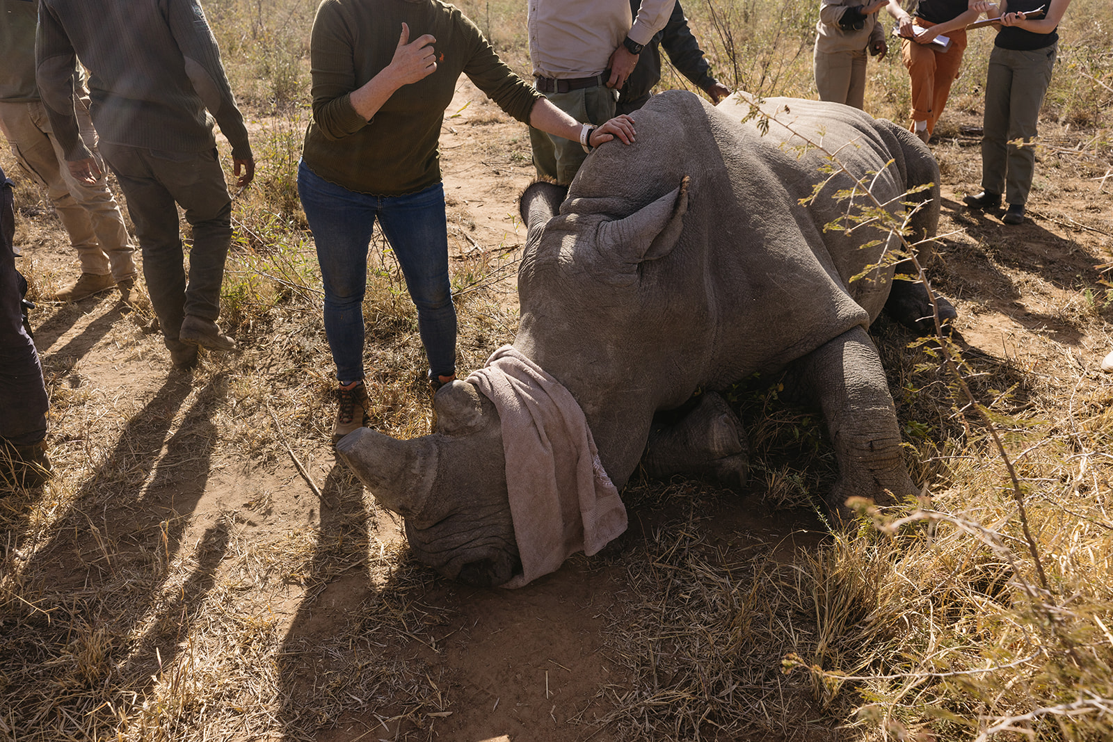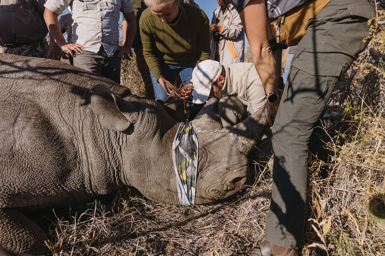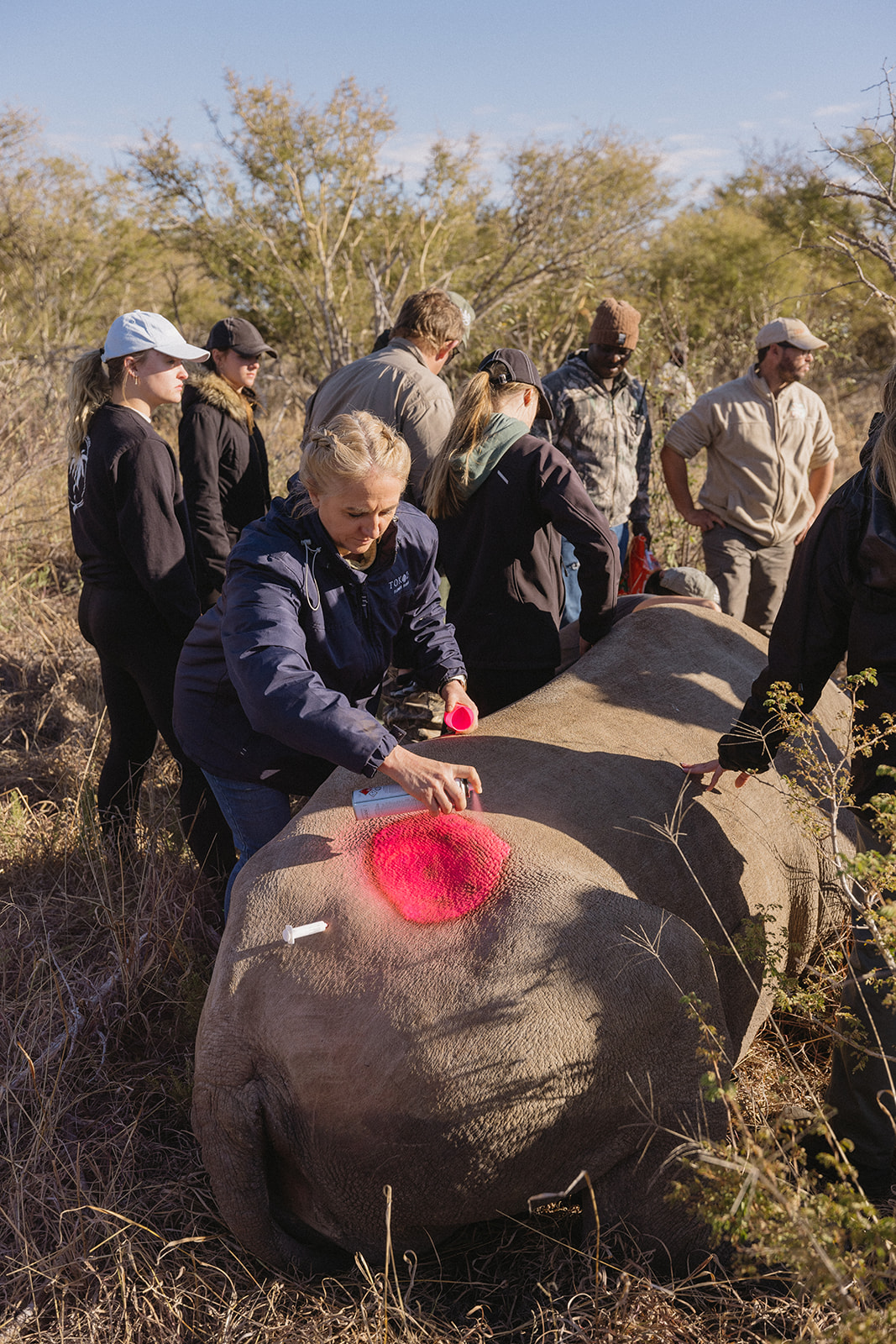 Das Team, bestehend aus zwei erfahrenen Wildtierärzten und einer Assistenz, wurde von den Helfern von Rhino Revolution sowie freiwilligen Helfern und der Leitung des Reservats unterstützt. Neben der körperlich anspruchsvollen Arbeit stellte das dicht mit Dornen bewachsene Reservat eine weitere Herausforderung dar. Schweres Equipment wie Kettensägen und 25-Liter-Wasserkanister, um die Tiere vor Überhitzung zu schützen, musste über hunderte Meter getragen werden.