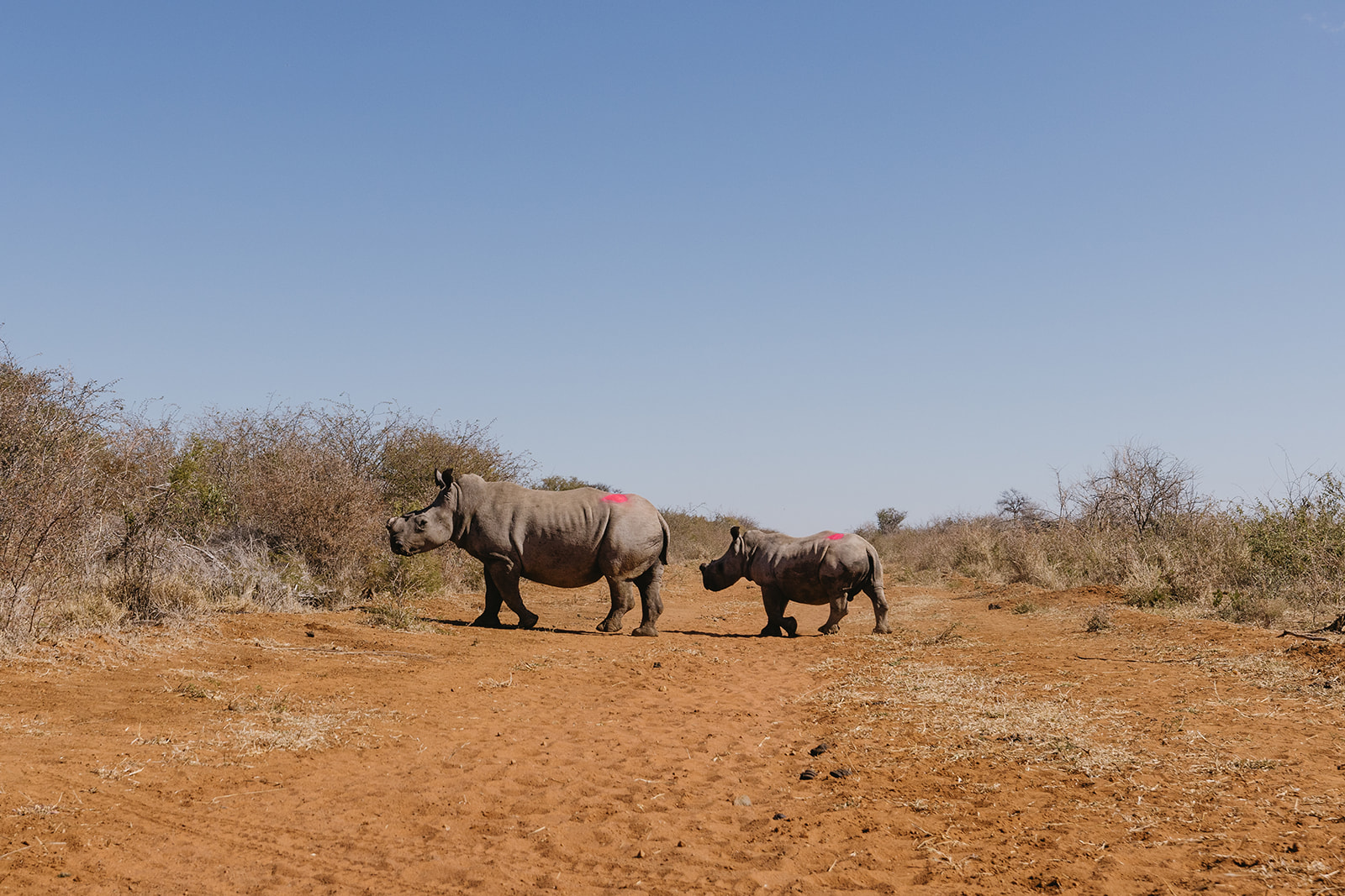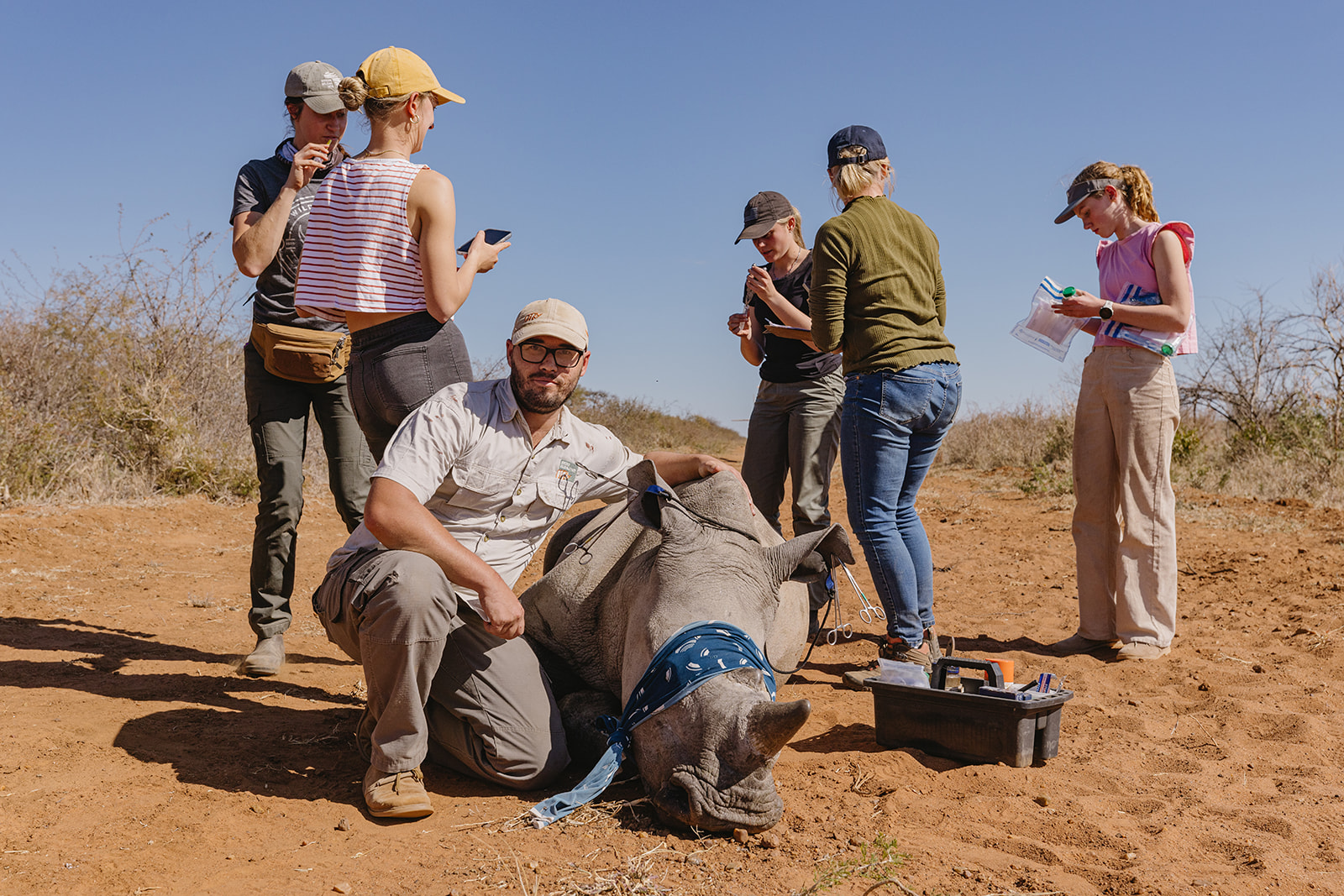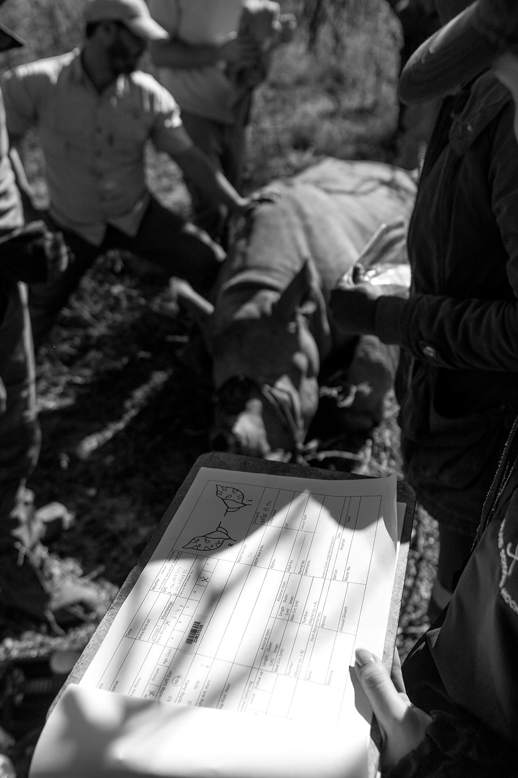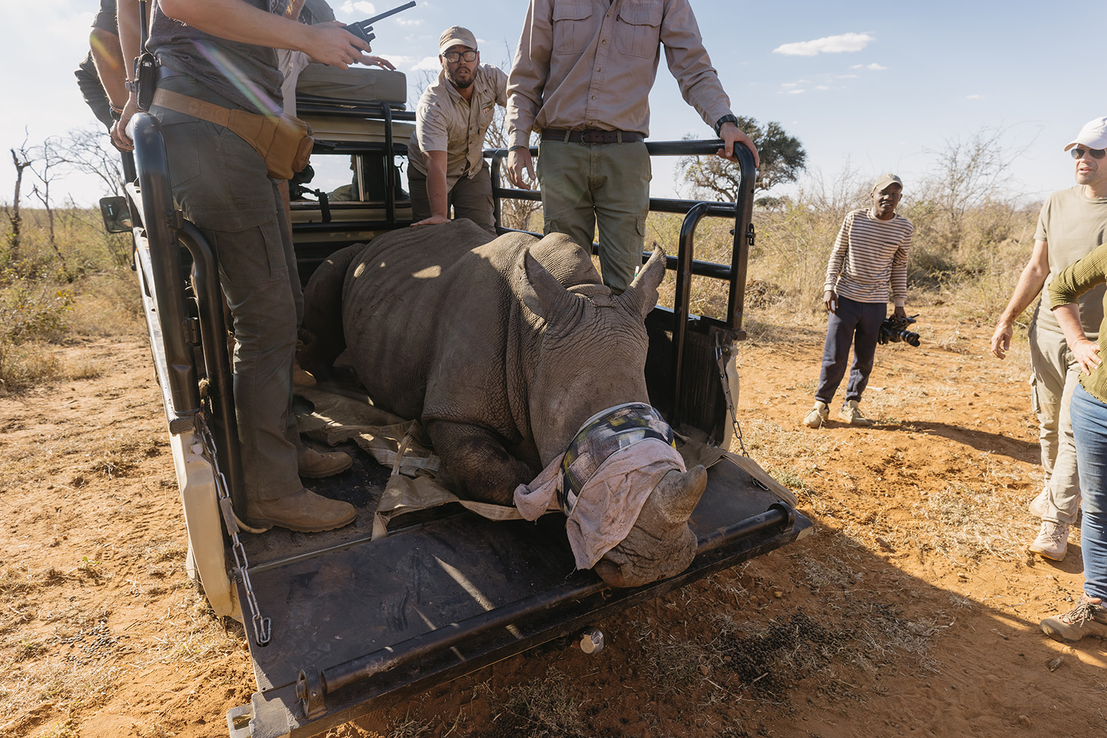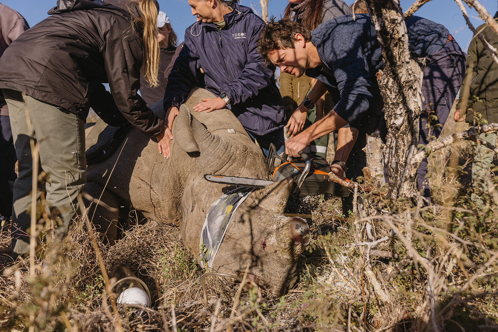 Das Team, bestehend aus zwei erfahrenen Wildtierärzten und einer Assistenz, wurde von den Helfern von Rhino Revolution sowie freiwilligen Helfern und der Leitung des Reservats unterstützt. Neben der körperlich anspruchsvollen Arbeit stellte das dicht mit Dornen bewachsene Reservat eine weitere Herausforderung dar. Schweres Equipment wie Kettensägen und 25-Liter-Wasserkanister, um die Tiere vor Überhitzung zu schützen, musste über hunderte Meter getragen werden.