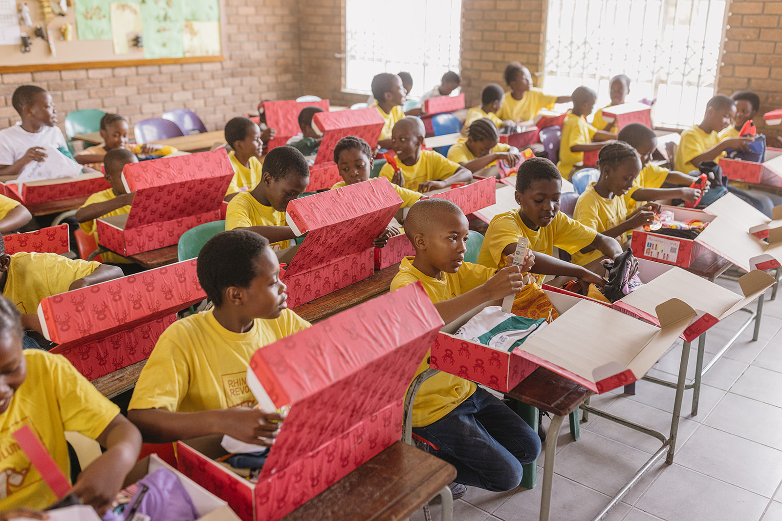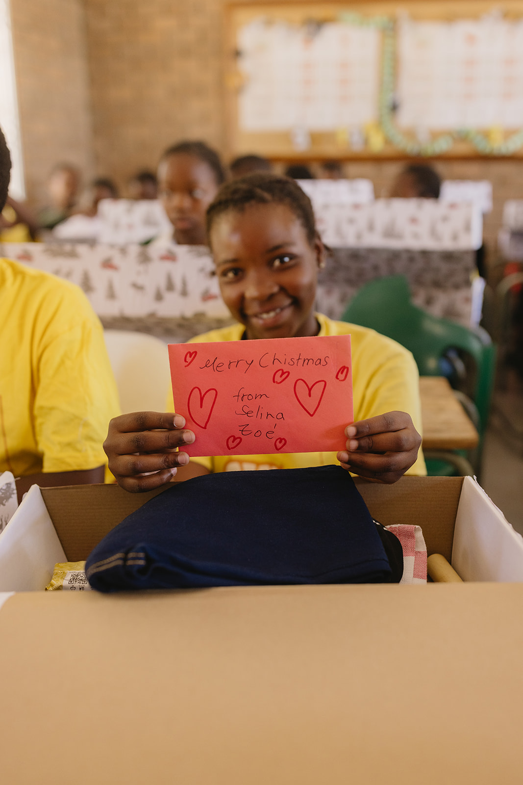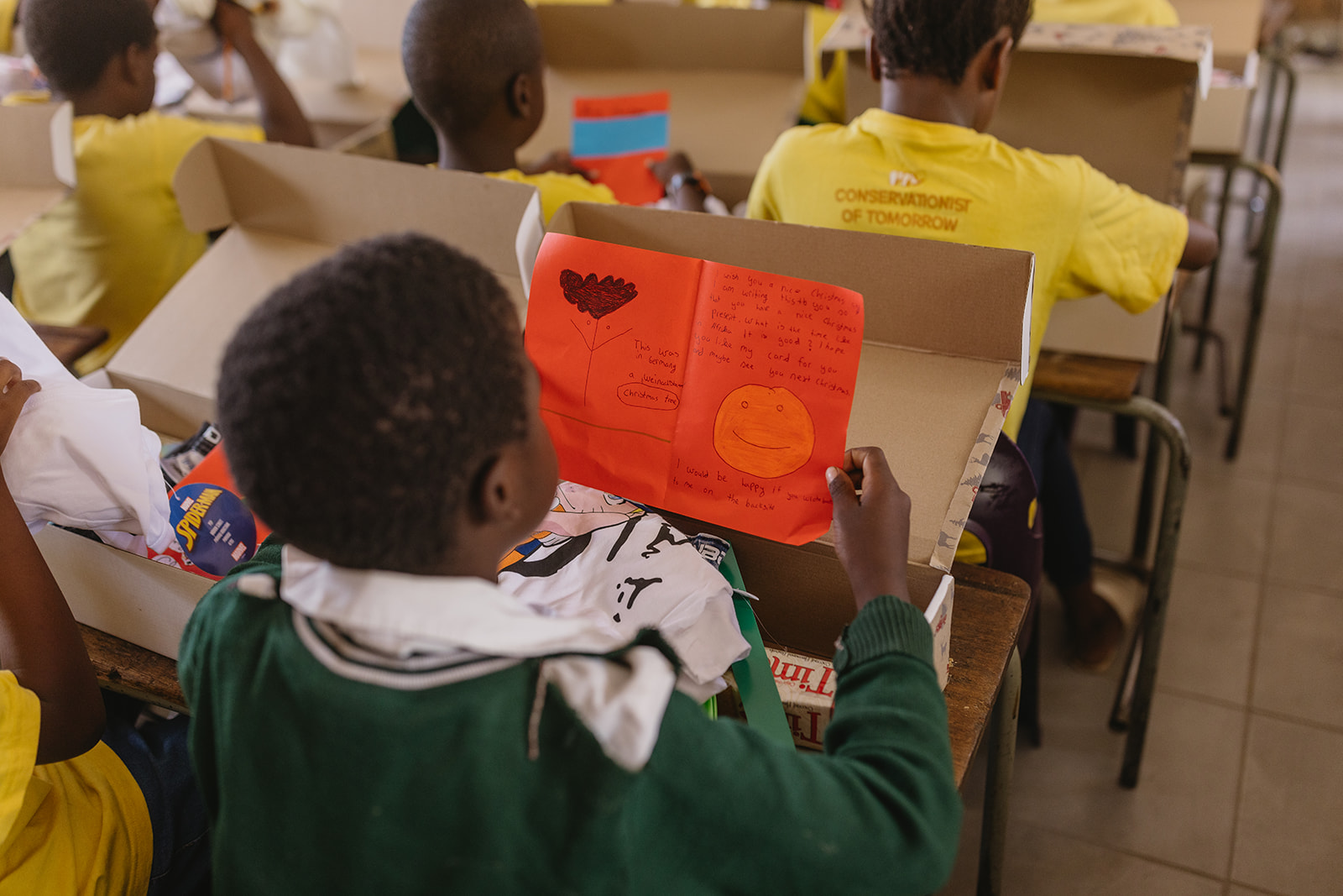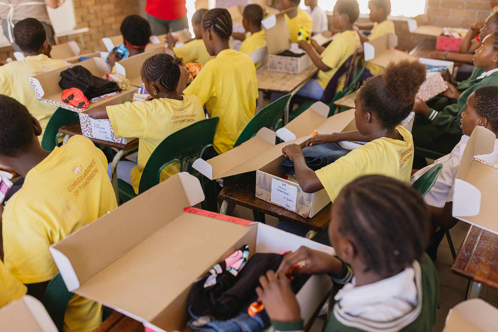 Die Übergabe der Santa Shoeboxes wurde sorgfältig vorbereitet. Bereits im Morgengrauen packten wir alle Geschenke in den Anhänger, den wir normalerweise für Nashorn-Transporte nutzen, und fuhren zur Schule, um die Klassenzimmer und Boxen vorzubereiten. Danke an Ben und Joel von Wildscapes für die Leihgabe des Anhängers. Die Schüler der Klassen 5a, b, c und 6a, b, c versammelten sich, und jeder durfte seine Shoebox gleichzeitig öffnen. Die Kinder konnten kaum glauben, dass sie heute ein Geschenk in den Händen halten – ein Moment voller Freude und Staunen.