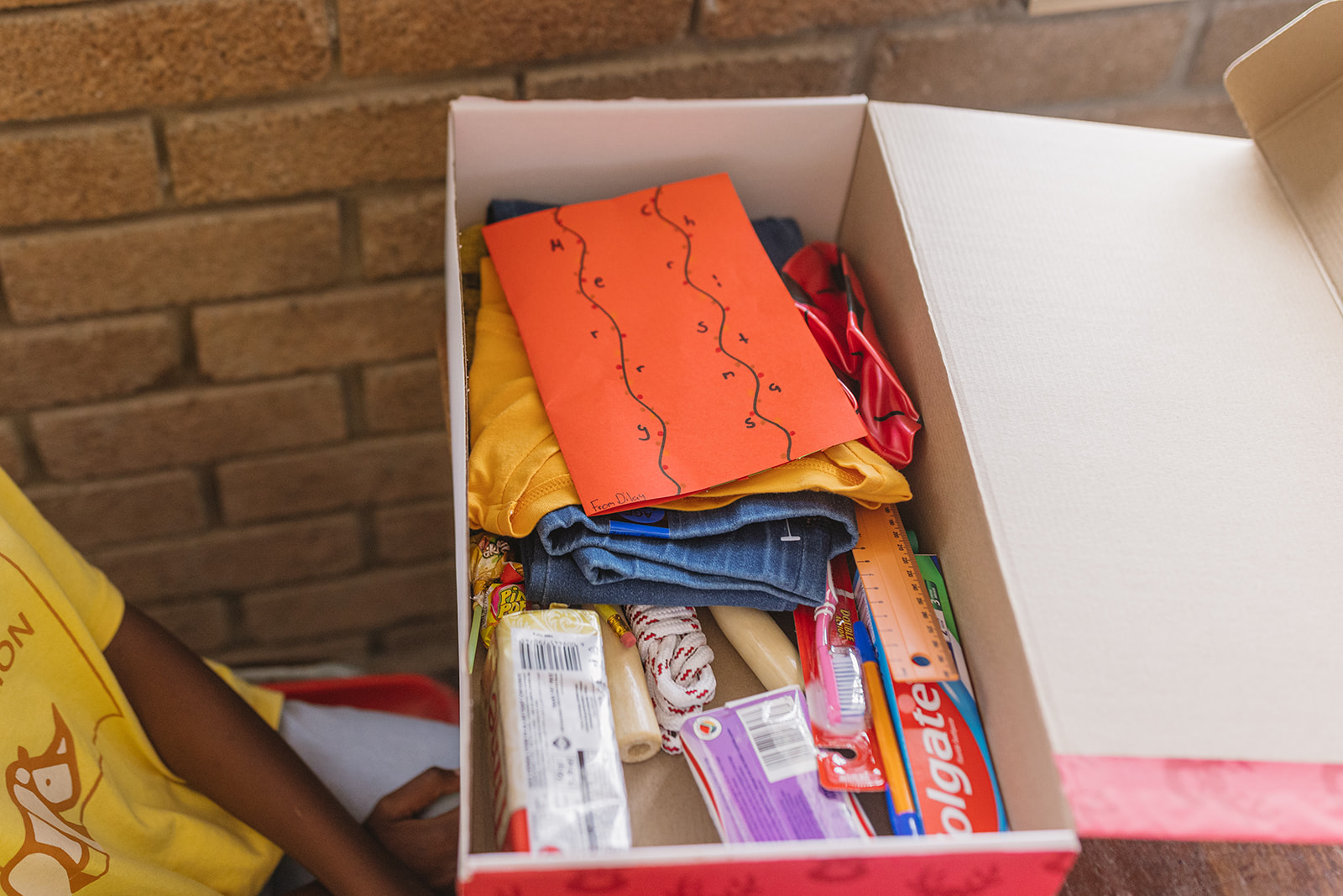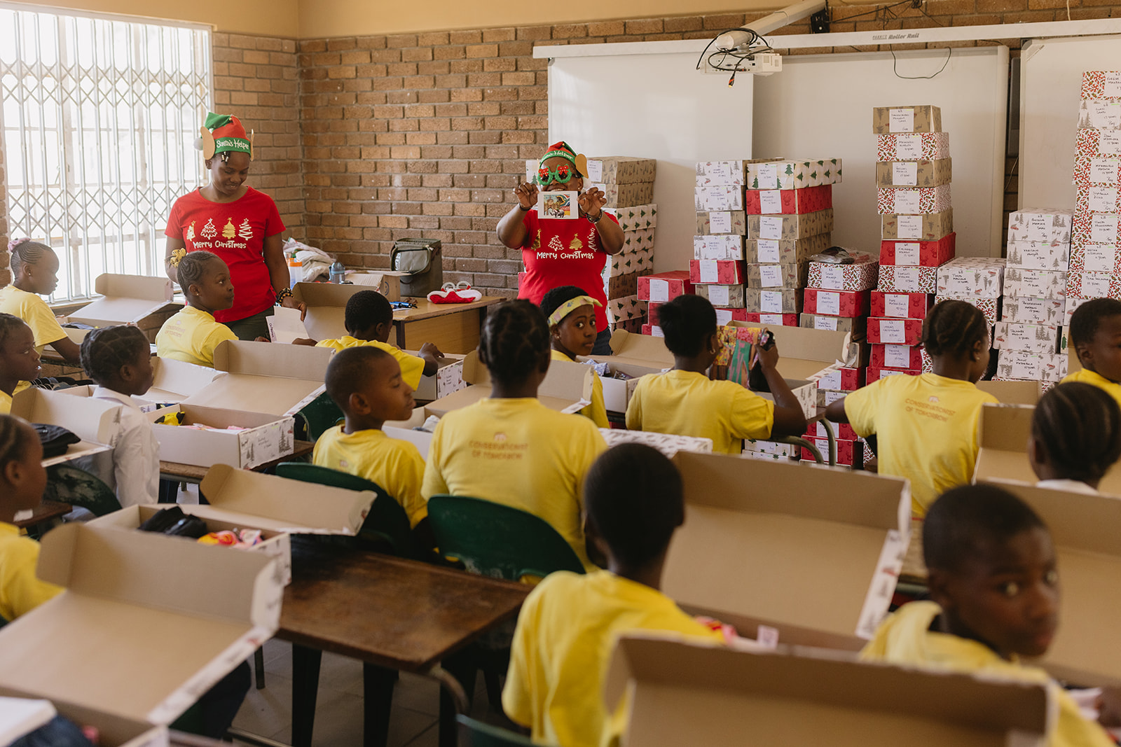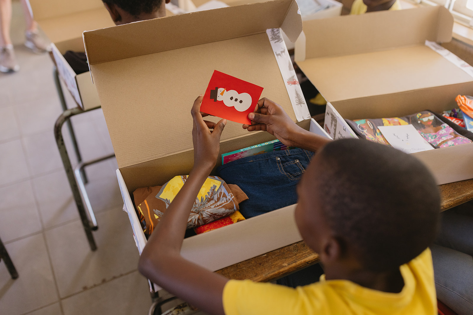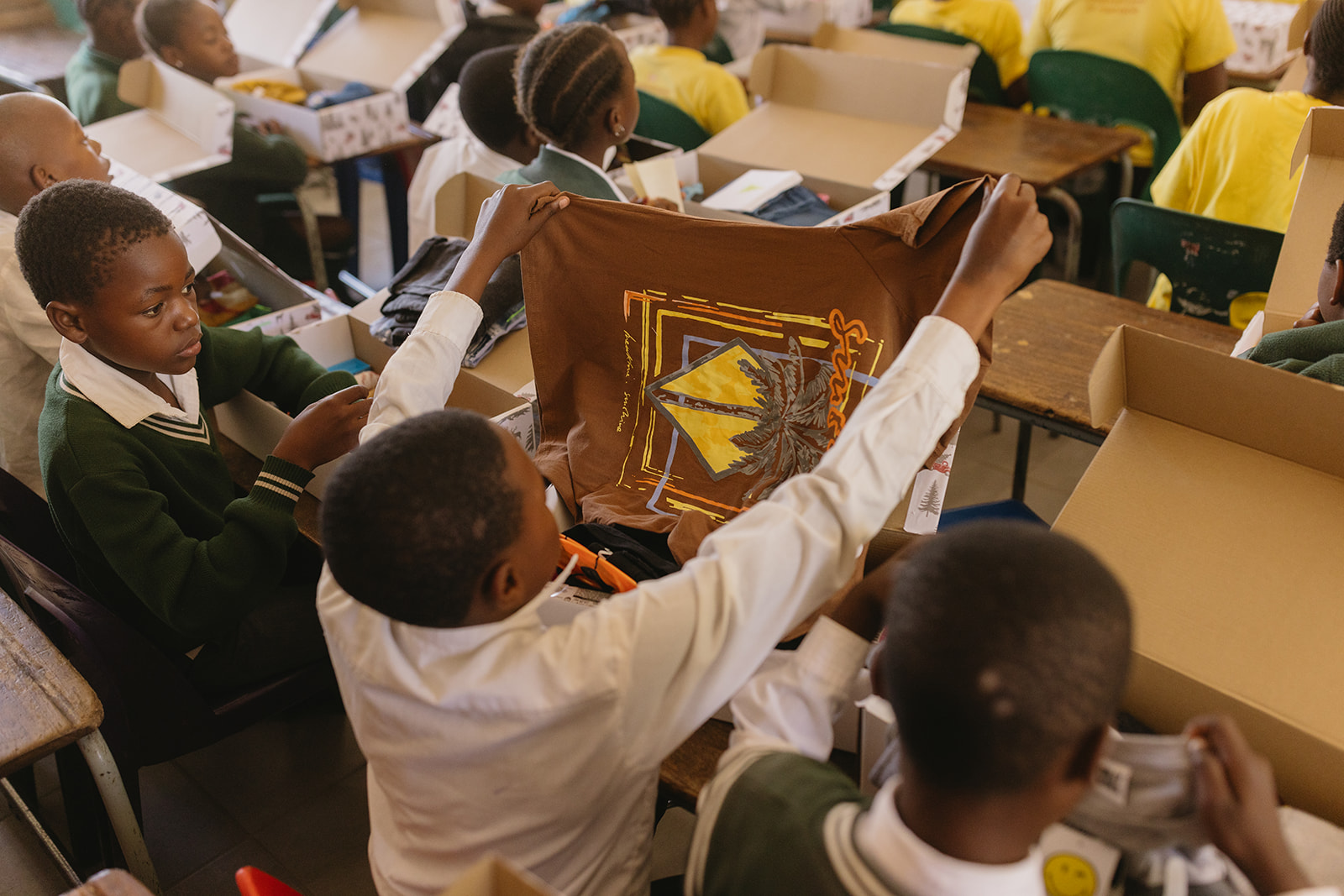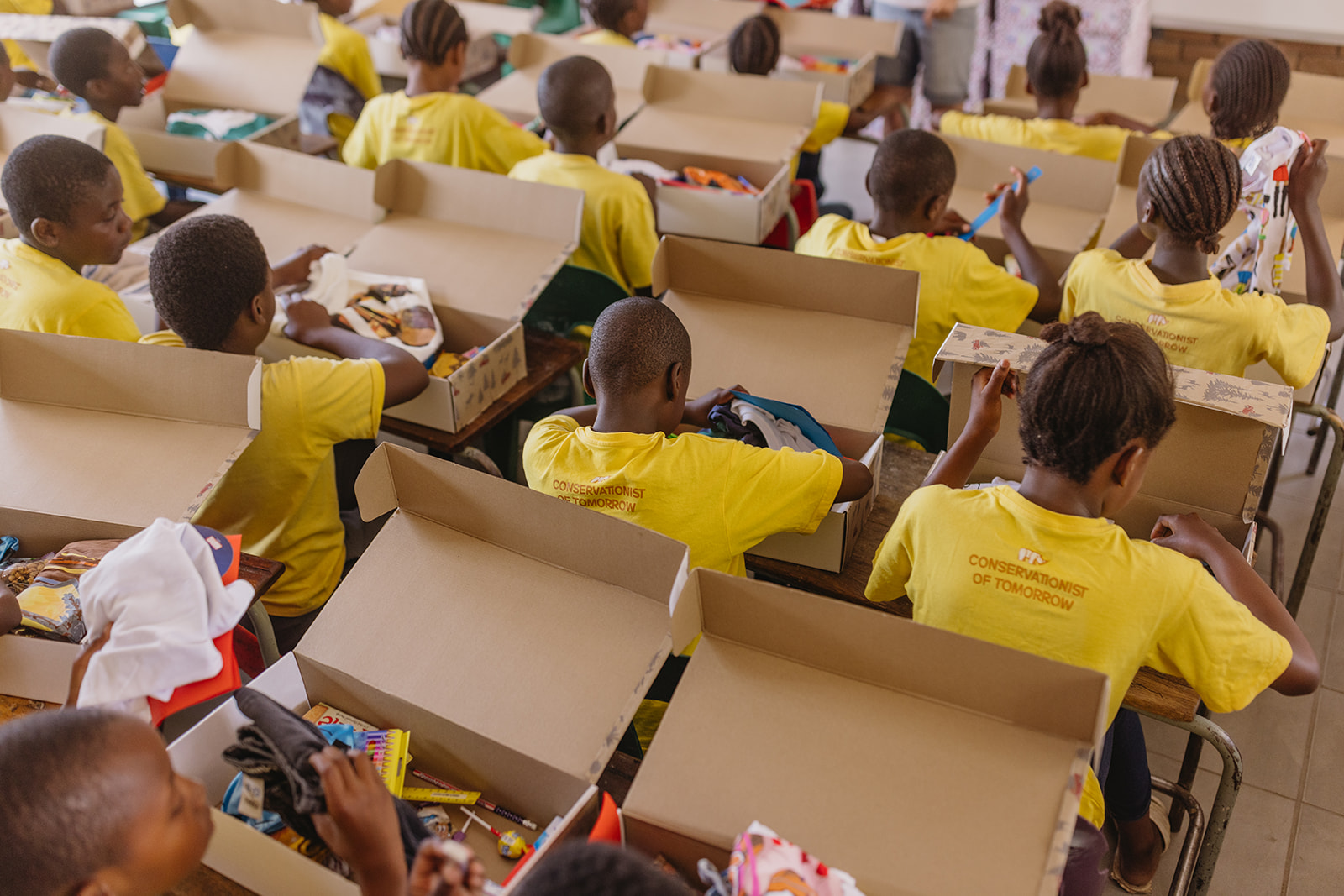 Die Übergabe der Santa Shoeboxes wurde sorgfältig vorbereitet. Bereits im Morgengrauen packten wir alle Geschenke in den Anhänger, den wir normalerweise für Nashorn-Transporte nutzen, und fuhren zur Schule, um die Klassenzimmer und Boxen vorzubereiten. Danke an Ben und Joel von Wildscapes für die Leihgabe des Anhängers. Die Schüler der Klassen 5a, b, c und 6a, b, c versammelten sich, und jeder durfte seine Shoebox gleichzeitig öffnen. Die Kinder konnten kaum glauben, dass sie heute ein Geschenk in den Händen halten – ein Moment voller Freude und Staunen.