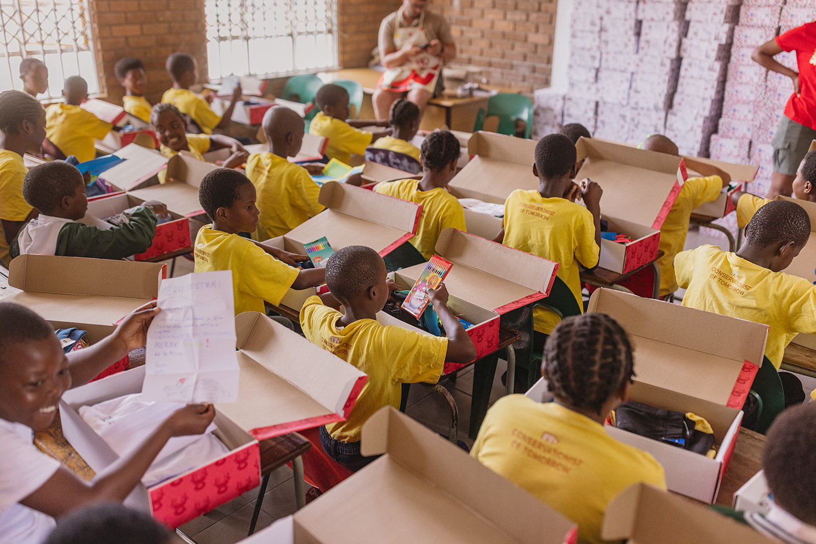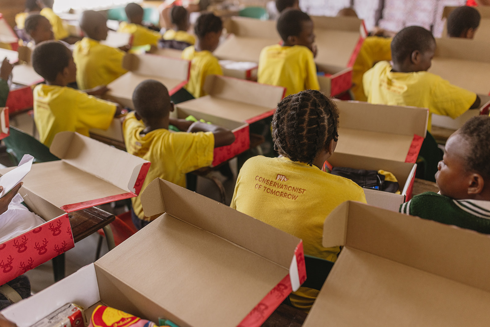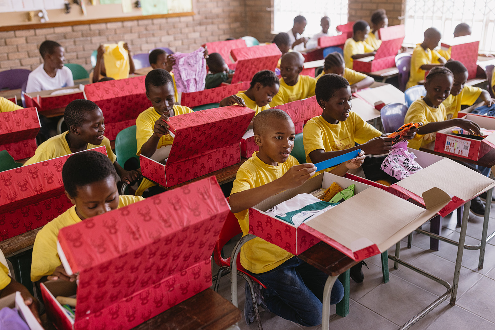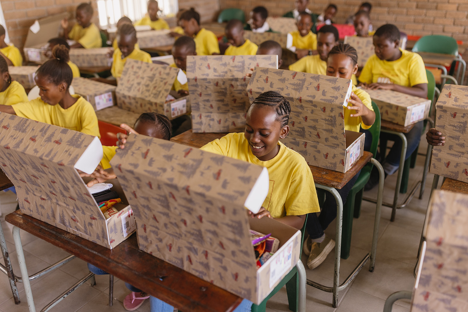 Die Übergabe der Santa Shoeboxes wurde sorgfältig vorbereitet. Bereits im Morgengrauen packten wir alle Geschenke in den Anhänger, den wir normalerweise für Nashorn-Transporte nutzen, und fuhren zur Schule, um die Klassenzimmer und Boxen vorzubereiten. Danke an Ben und Joel von Wildscapes für die Leihgabe des Anhängers. Die Schüler der Klassen 5a, b, c und 6a, b, c versammelten sich, und jeder durfte seine Shoebox gleichzeitig öffnen. Die Kinder konnten kaum glauben, dass sie heute ein Geschenk in den Händen halten – ein Moment voller Freude und Staunen.
