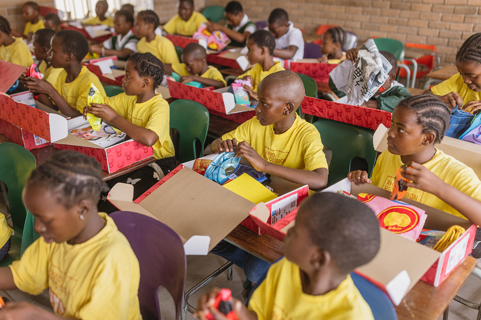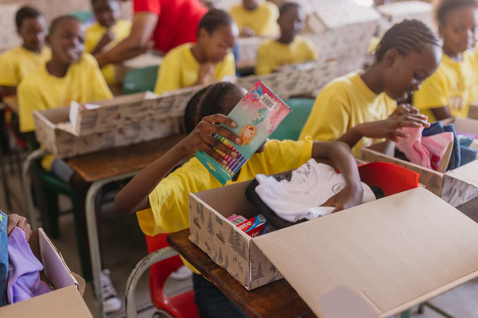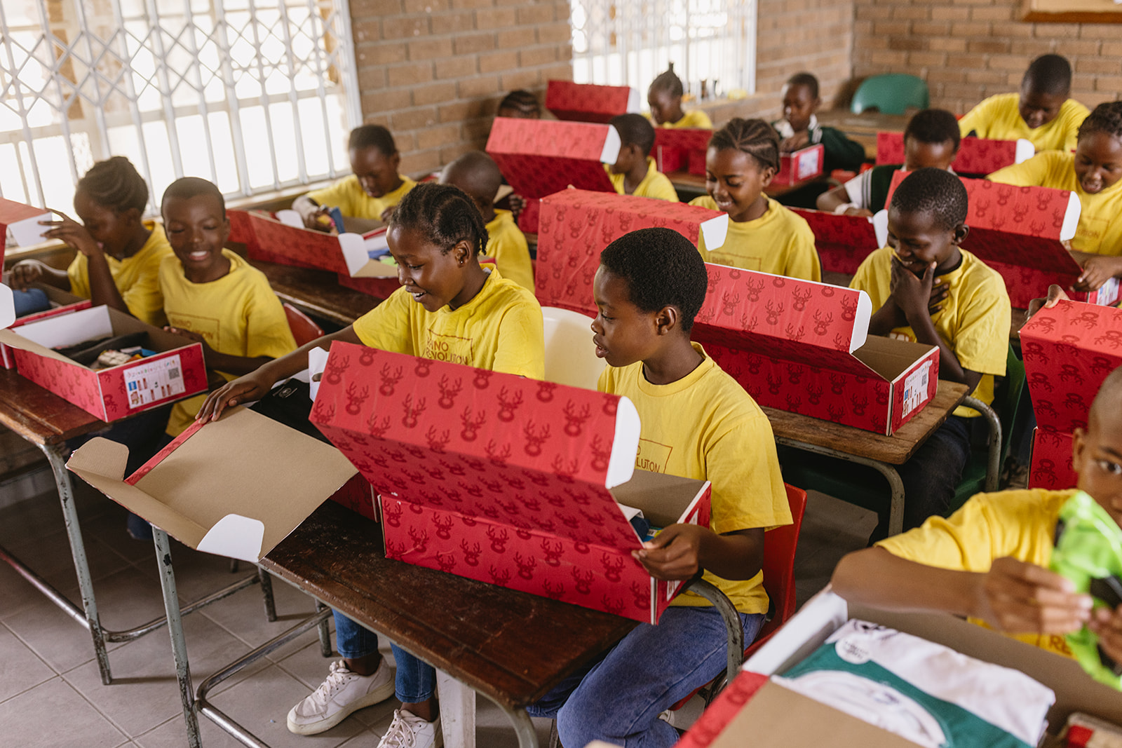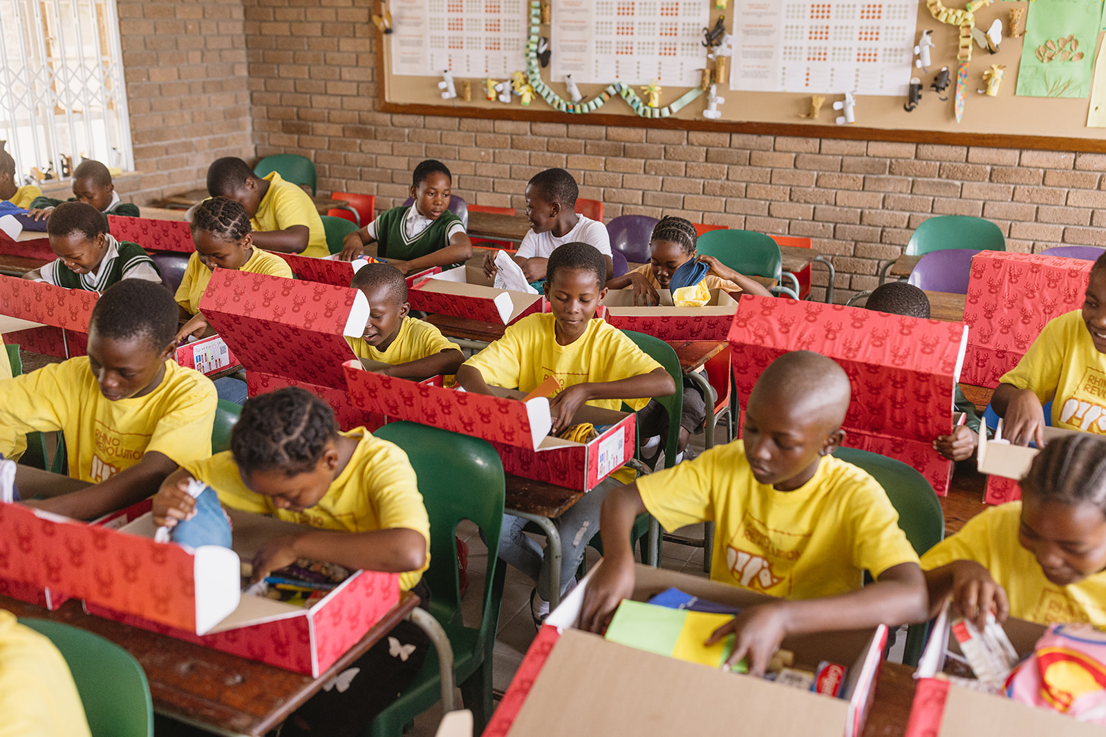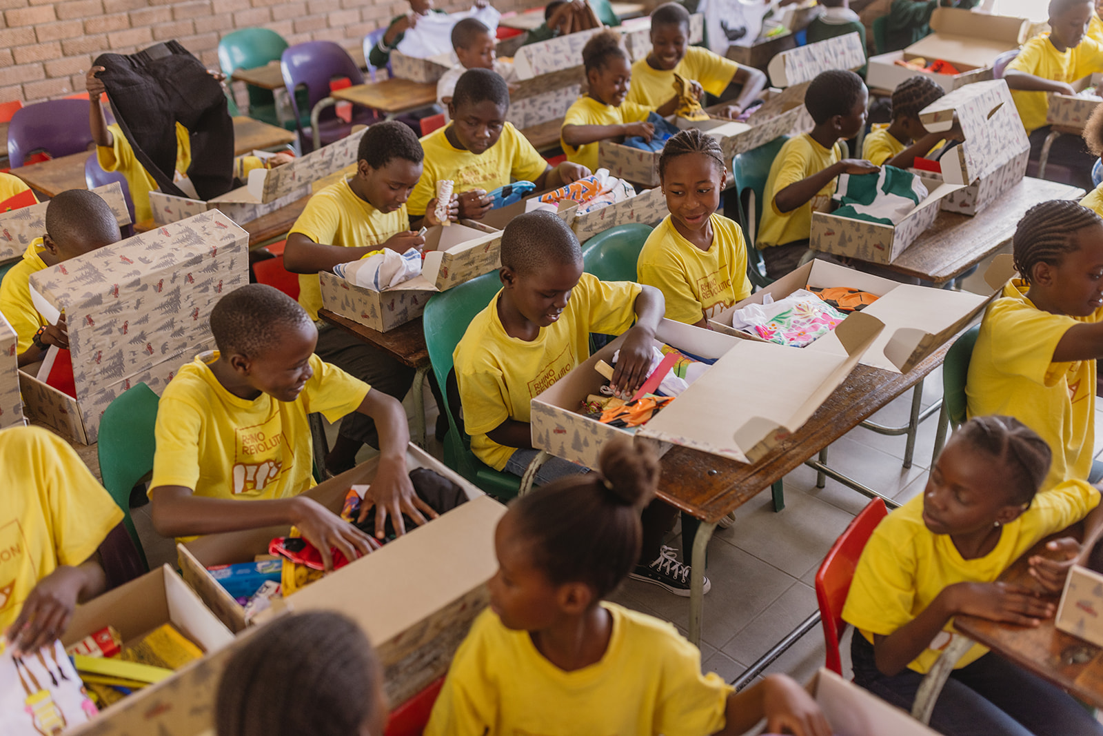 Die Übergabe der Santa Shoeboxes wurde sorgfältig vorbereitet. Bereits im Morgengrauen packten wir alle Geschenke in den Anhänger, den wir normalerweise für Nashorn-Transporte nutzen, und fuhren zur Schule, um die Klassenzimmer und Boxen vorzubereiten. Danke an Ben und Joel von Wildscapes für die Leihgabe des Anhängers. Die Schüler der Klassen 5a, b, c und 6a, b, c versammelten sich, und jeder durfte seine Shoebox gleichzeitig öffnen. Die Kinder konnten kaum glauben, dass sie heute ein Geschenk in den Händen halten – ein Moment voller Freude und Staunen.