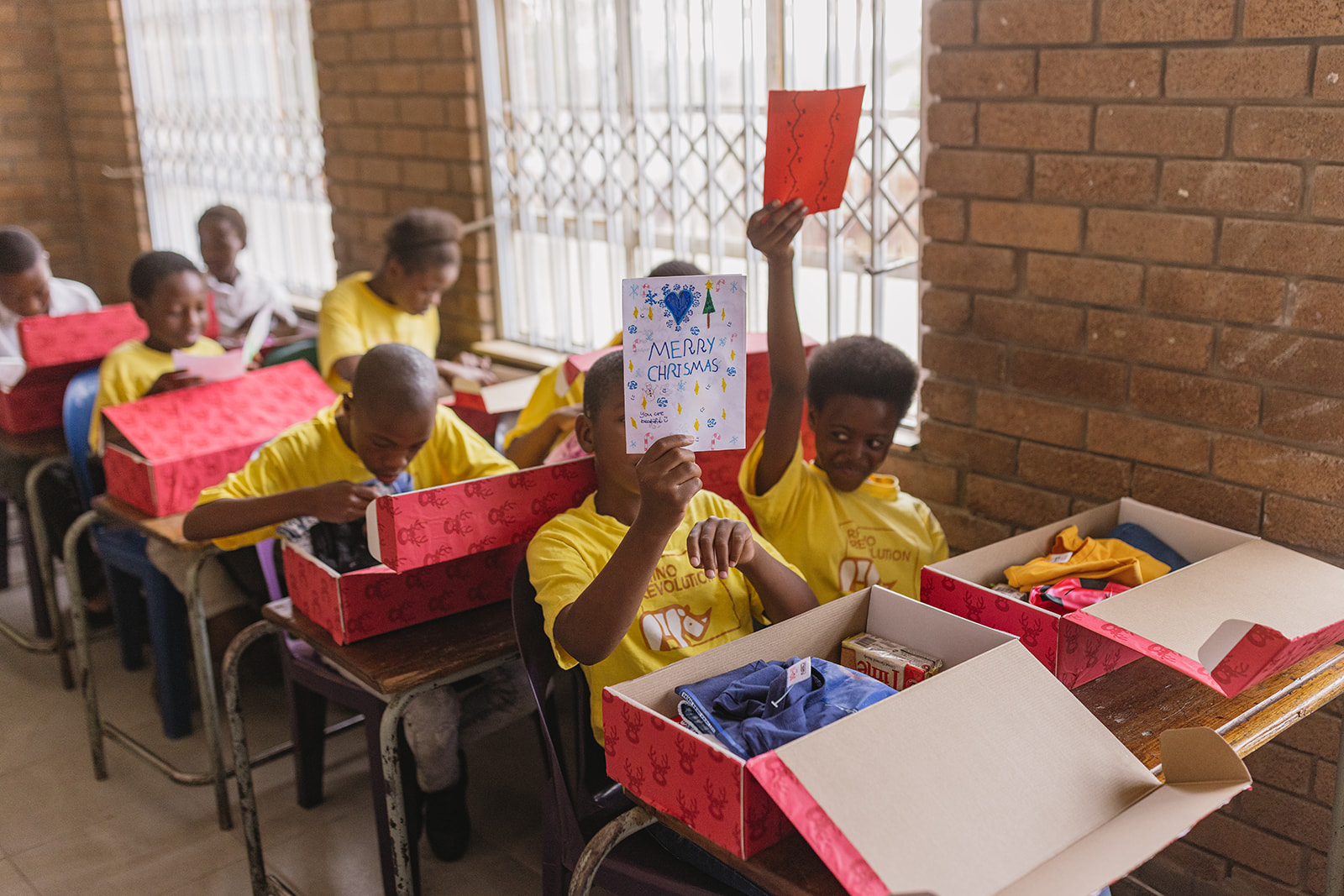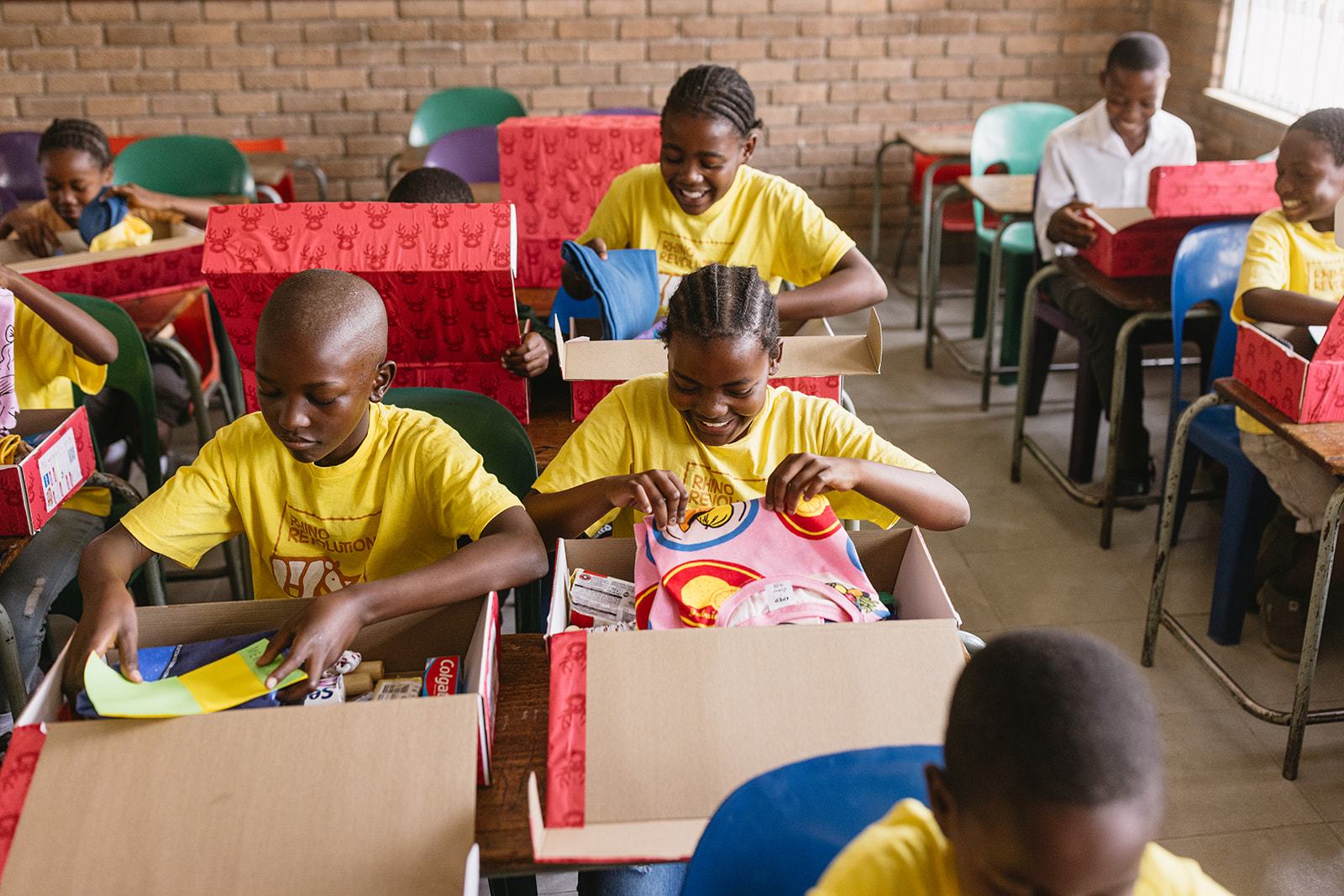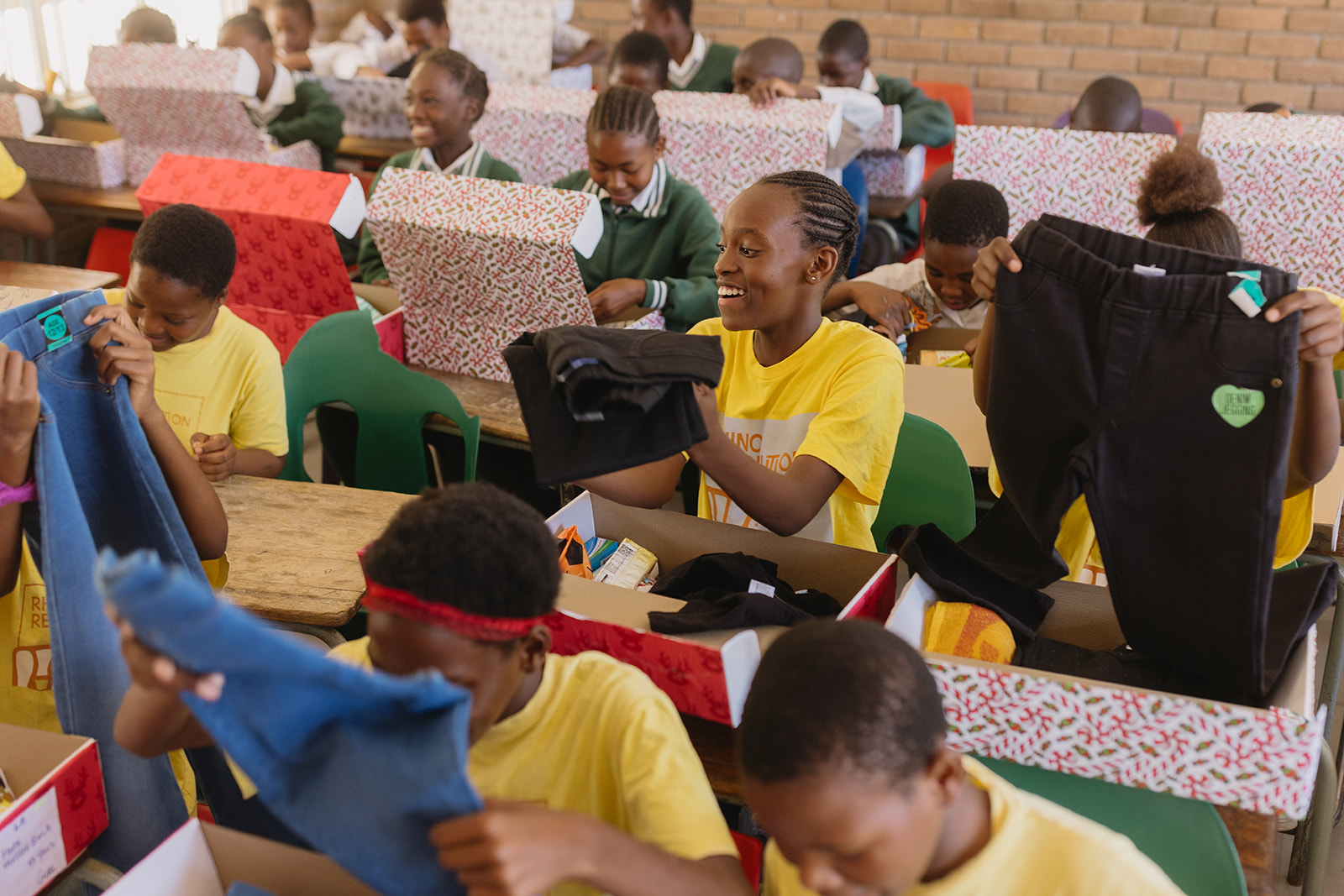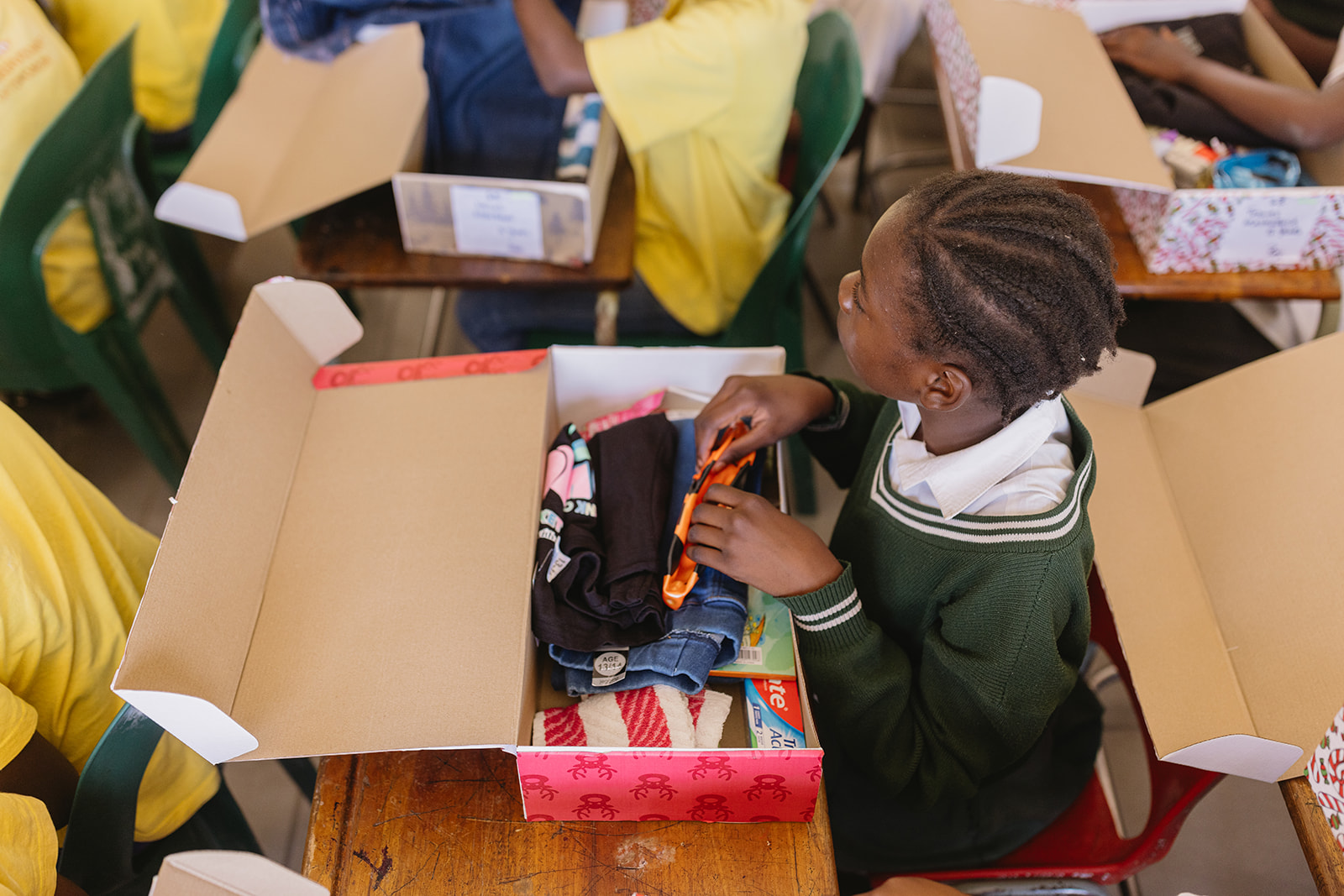 Die Übergabe der Santa Shoeboxes wurde sorgfältig vorbereitet. Bereits im Morgengrauen packten wir alle Geschenke in den Anhänger, den wir normalerweise für Nashorn-Transporte nutzen, und fuhren zur Schule, um die Klassenzimmer und Boxen vorzubereiten. Danke an Ben und Joel von Wildscapes für die Leihgabe des Anhängers. Die Schüler der Klassen 5a, b, c und 6a, b, c versammelten sich, und jeder durfte seine Shoebox gleichzeitig öffnen. Die Kinder konnten kaum glauben, dass sie heute ein Geschenk in den Händen halten – ein Moment voller Freude und Staunen.