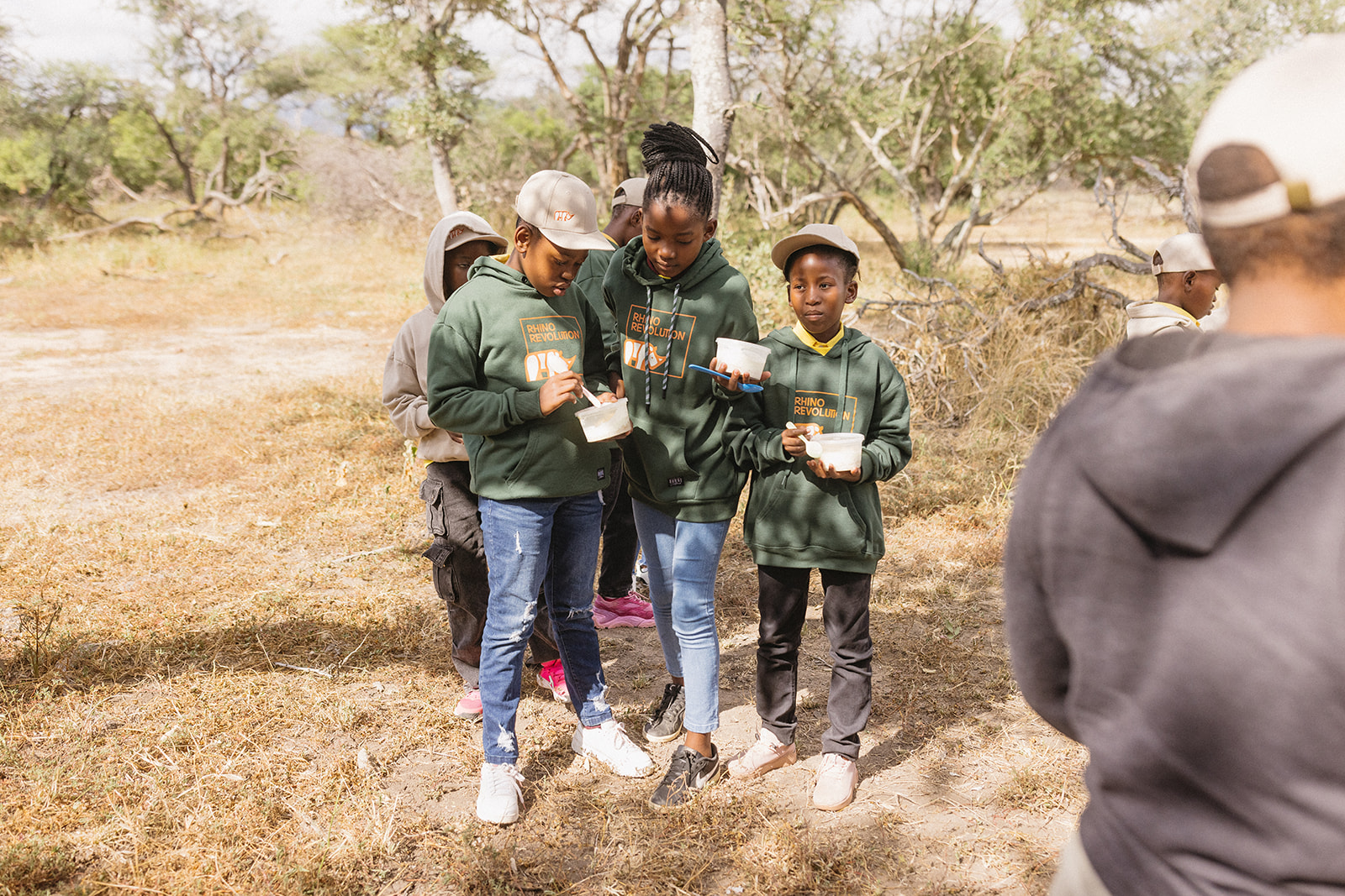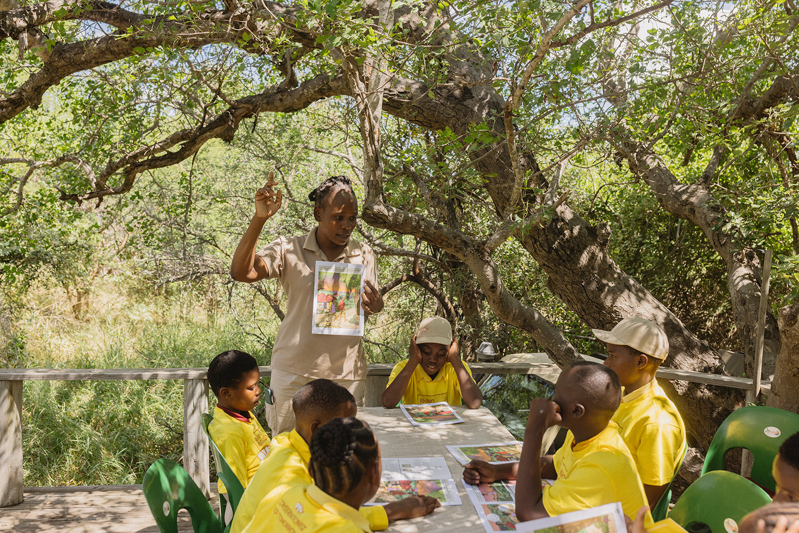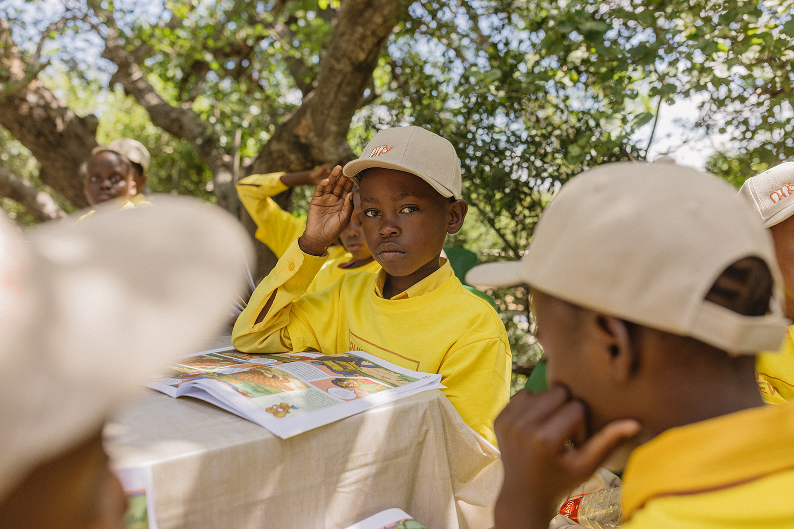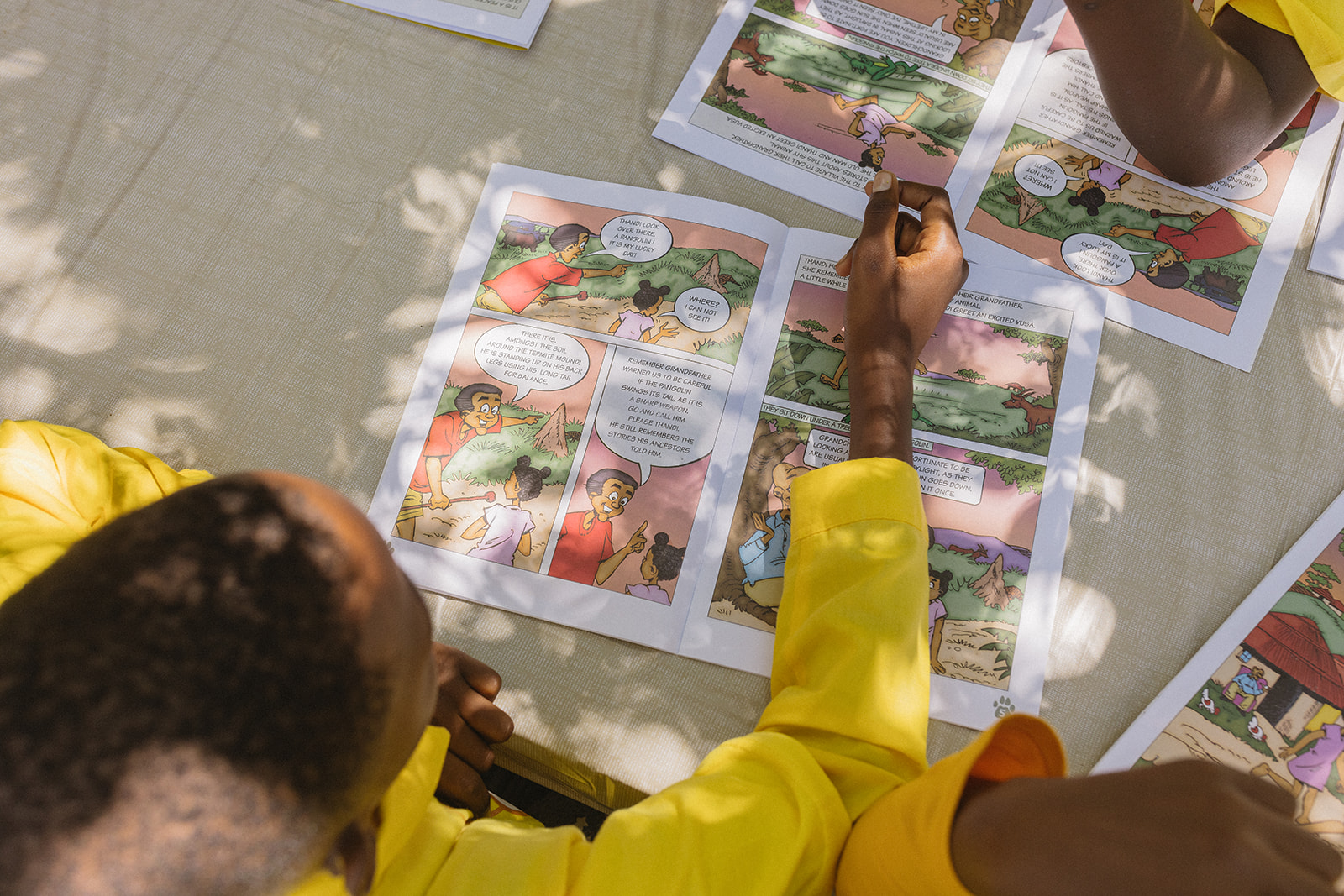 Zur Mittagszeit legten die Kinder eine Pause mit einem stärkenden Mittagessen ein. In dieser Zeit fand auch eine kleine Unterrichtseinheit statt, bei der die Kinder mehr über das gefährdete Schuppentier erfuhren. Diese Unterrichtseinheit verband ökologische Themen mit sprachlichen Fähigkeiten: Die Kinder erweiterten ihre Englischkenntnisse und verbesserten ihre Lesefähigkeiten, indem sie gemeinsam einen kindgerechten Naturschutz-Comic lasen, der die Informationen durch anschauliche Bilder greifbar machte und das Thema auf spielerische Weise einführte.