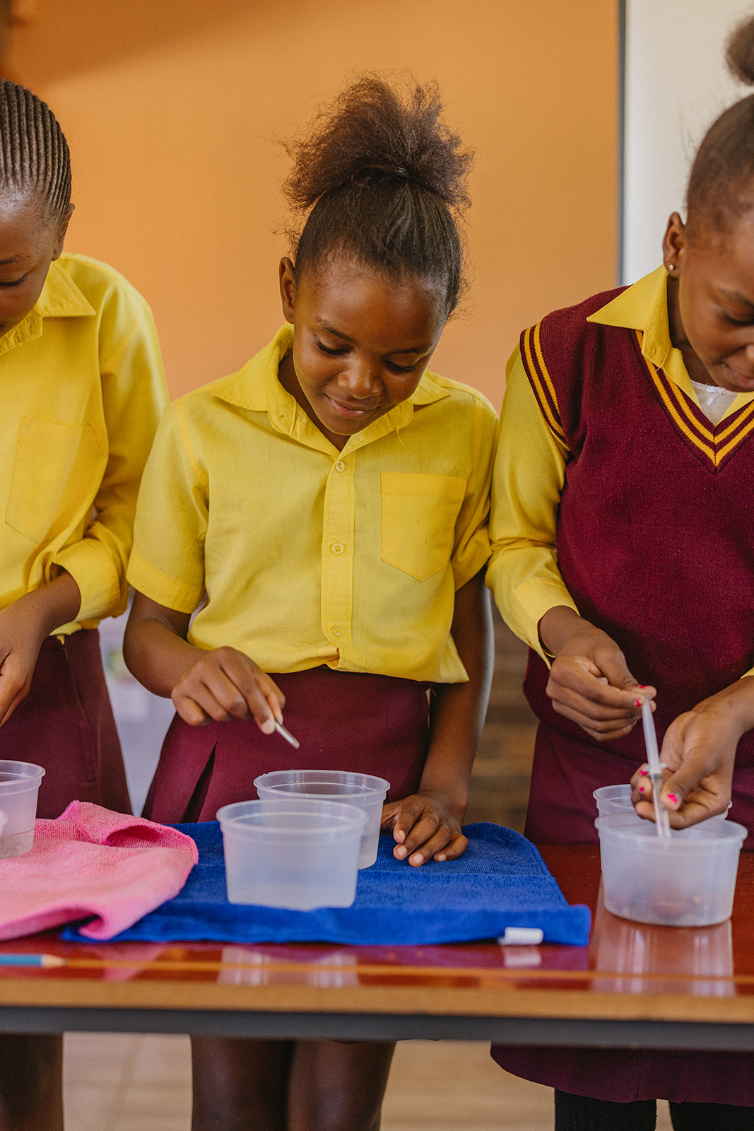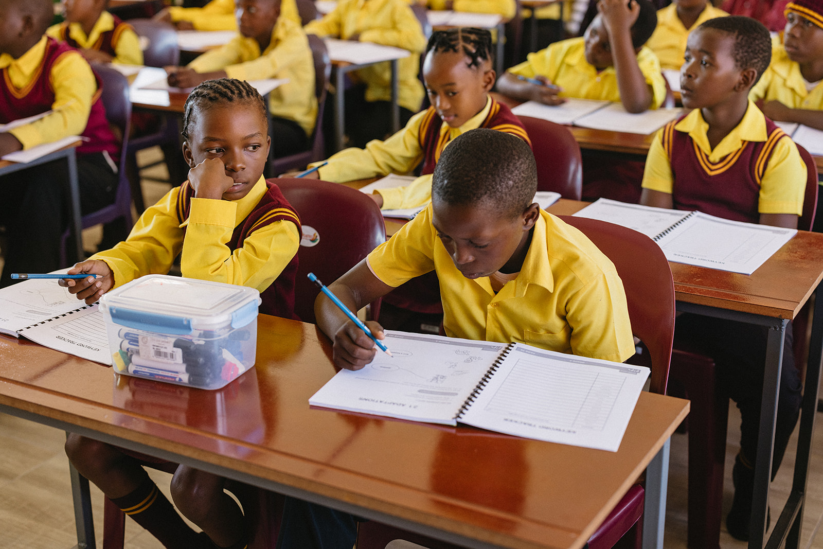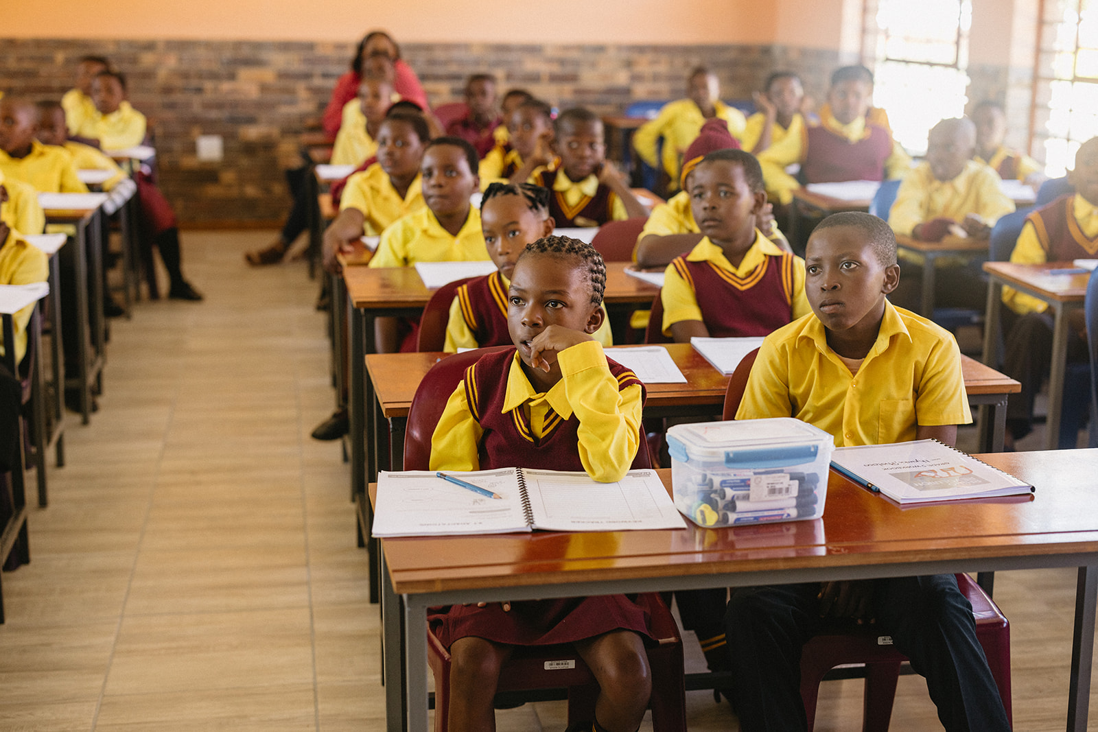 Mit großer Freude wurden die Kinder der Klassen 5A, 5B und 5C im neuen Klassenzimmer empfangen. Allein die beiden Klassen 5A und 5B zählen jeweils über 70 Kinder, die zur gleichen Zeit unterrichtet werden – in der Klasse 5C sind es 63 Kinder. Der neue Raum wurde so gestaltet, dass er dieser Herausforderung gerecht wird: Nicht mehr als zwei Kinder teilen sich einen Tisch, jedes Kind hat einen eigenen Stuhl, und das Lehrpersonal kann sich frei zwischen den Tischen bewegen, um individuell Hilfestellung zu geben.