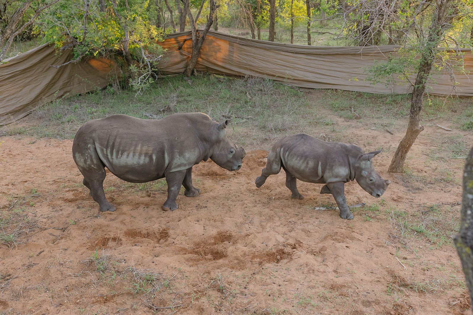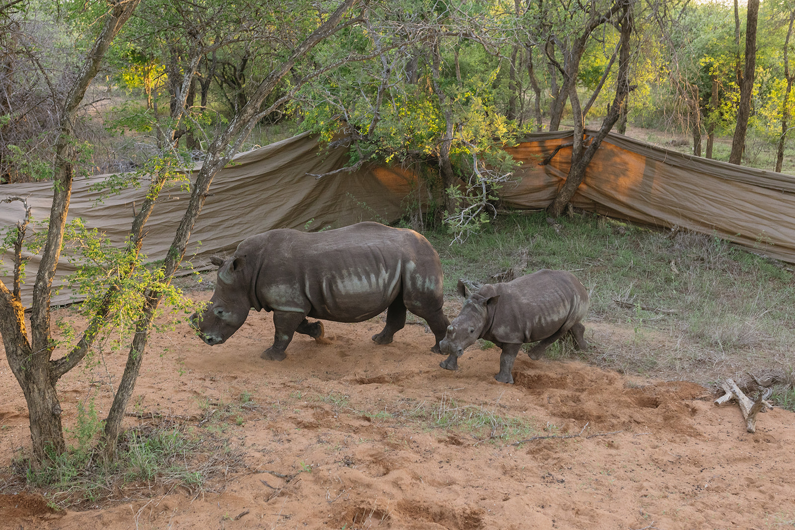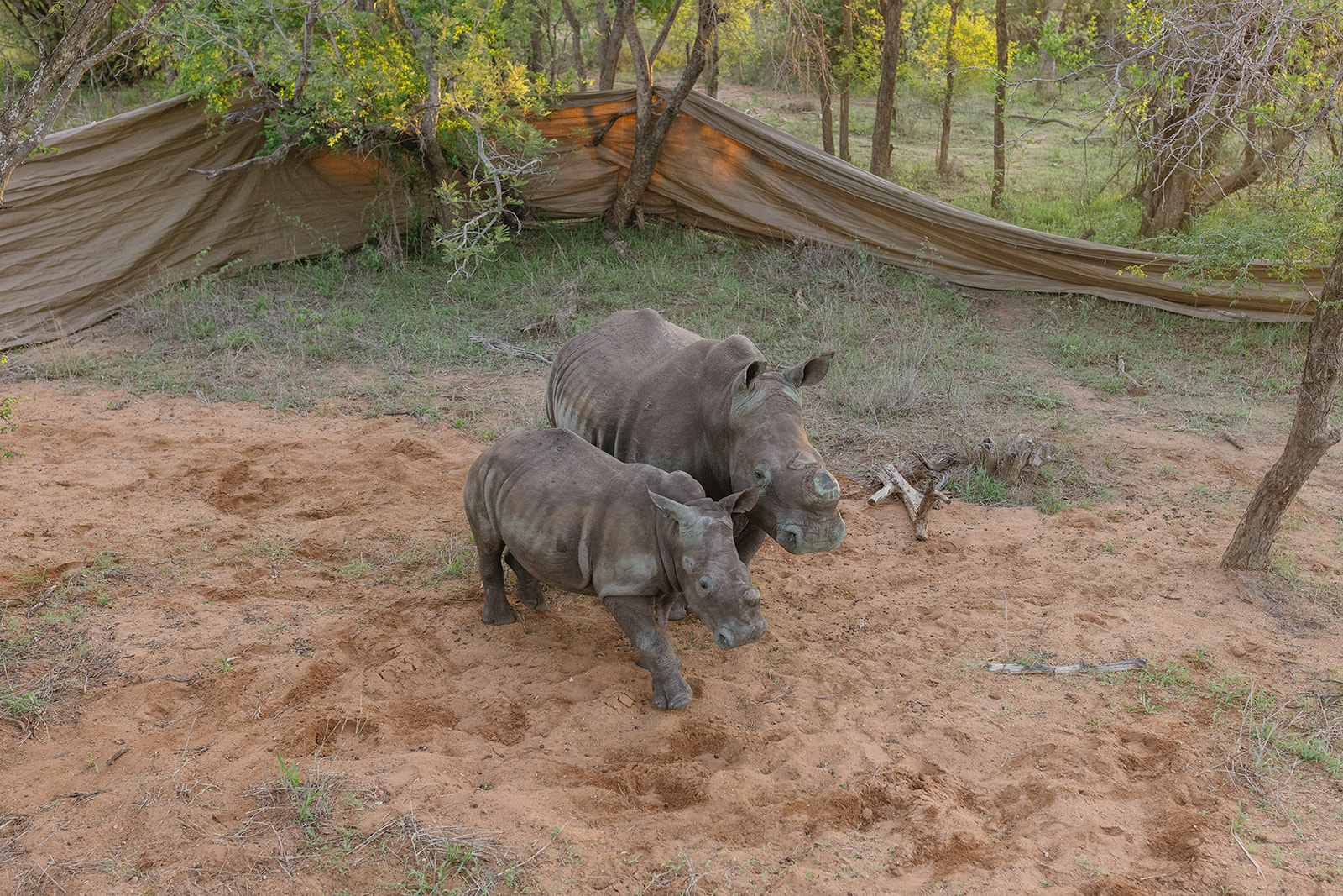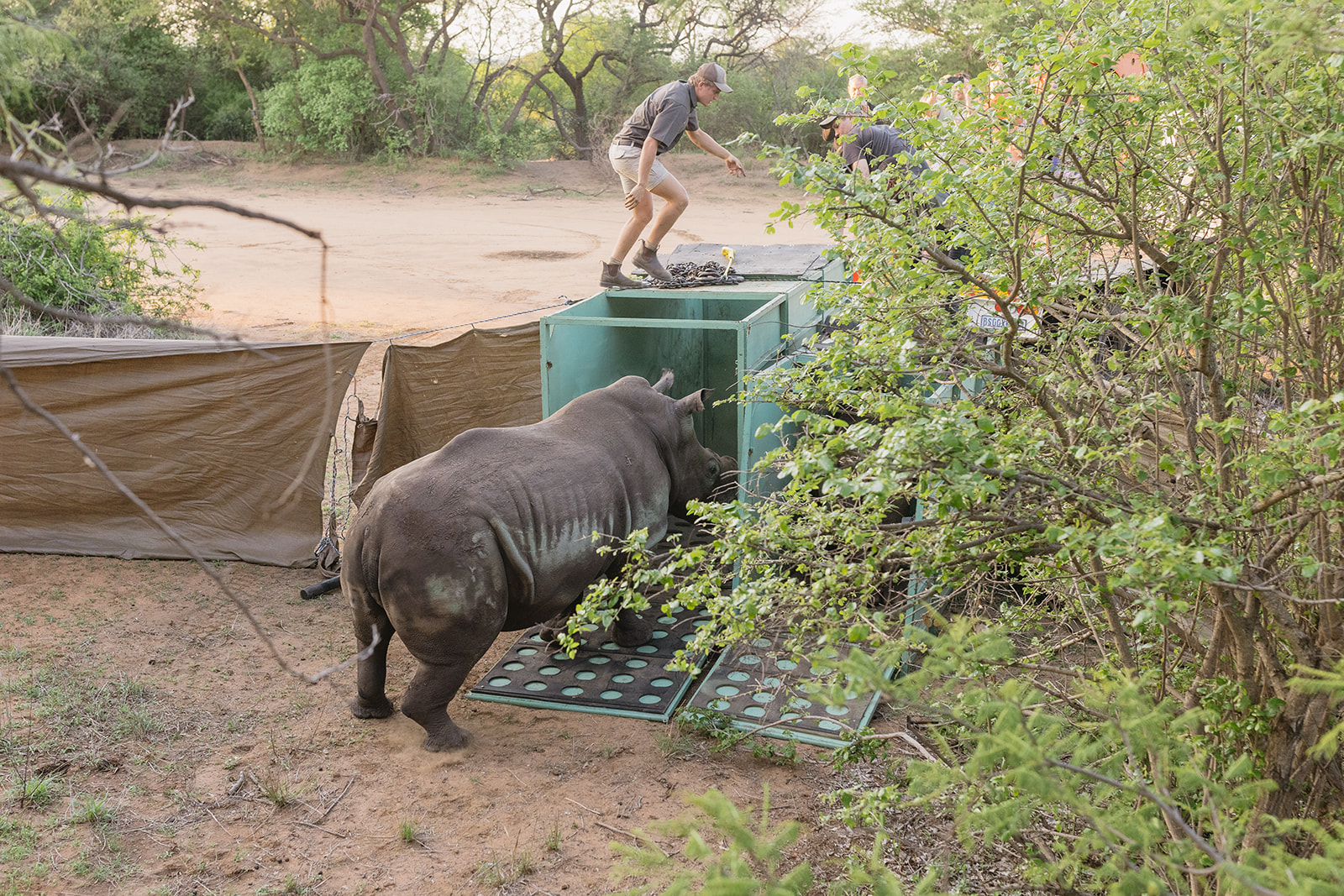 Nach einer mehrstündigen Fahrt erreichte der Transportkonvoi gegen 17 Uhr das Ziel. Das Team von Rhino Revolution hatte eine nahegelegene Wasserstelle als idealen Auswilderungsort vorbereitet, um den Tieren nach der Reise sofort Zugang zu Wasser und Futter zu ermöglichen. Damit Mutter und Kalb nicht getrennt werden, wurden die Transportboxen in einem vorübergehenden Gehege aus blickdichten Outdoorstoffen aufgestellt. Diese Maßnahme stellte sicher, dass die Tiere nach dem Verlassen der Box nicht in Panik in verschiedene Richtungen liefen.