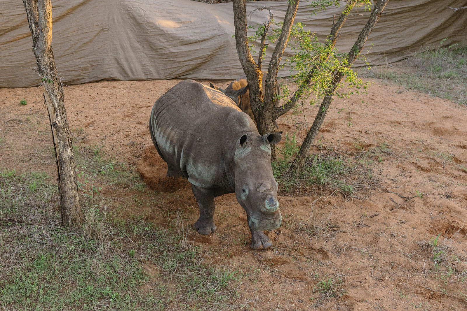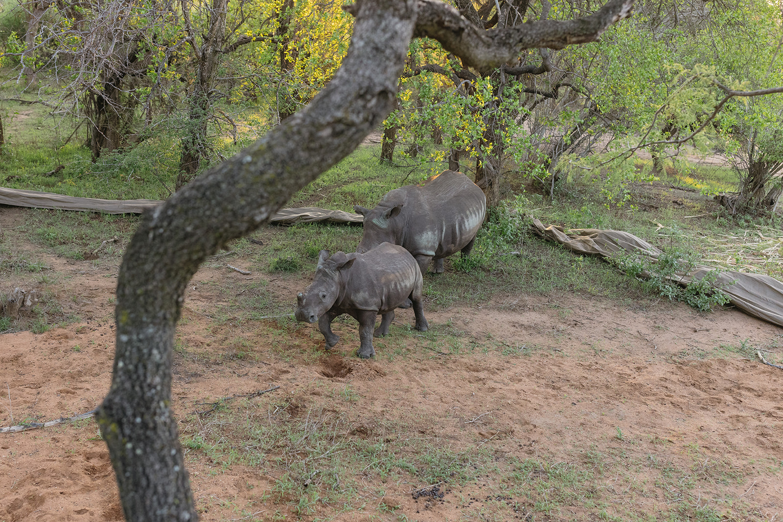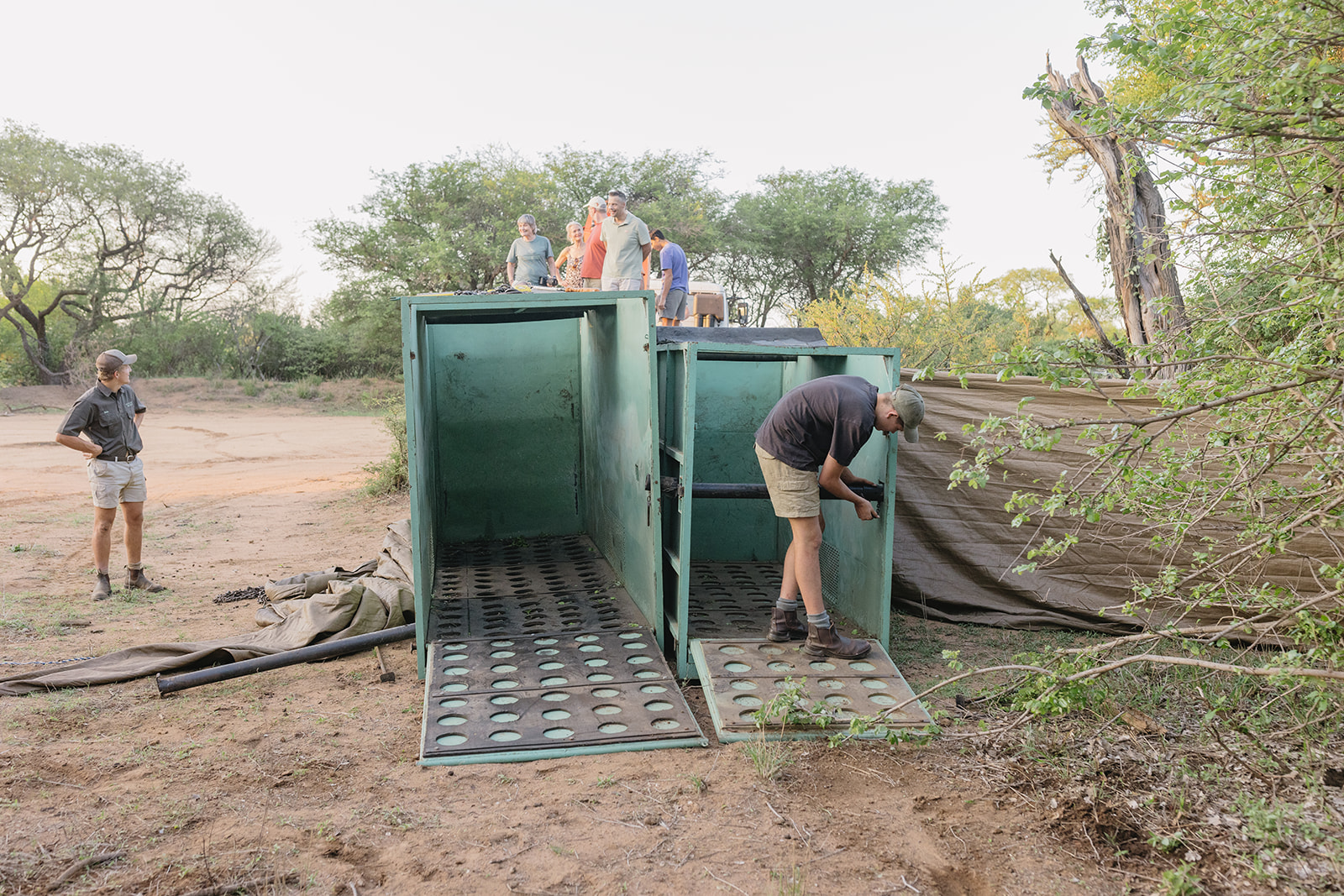 Nach einer mehrstündigen Fahrt erreichte der Transportkonvoi gegen 17 Uhr das Ziel. Das Team von Rhino Revolution hatte eine nahegelegene Wasserstelle als idealen Auswilderungsort vorbereitet, um den Tieren nach der Reise sofort Zugang zu Wasser und Futter zu ermöglichen. Damit Mutter und Kalb nicht getrennt werden, wurden die Transportboxen in einem vorübergehenden Gehege aus blickdichten Outdoorstoffen aufgestellt. Diese Maßnahme stellte sicher, dass die Tiere nach dem Verlassen der Box nicht in Panik in verschiedene Richtungen liefen.