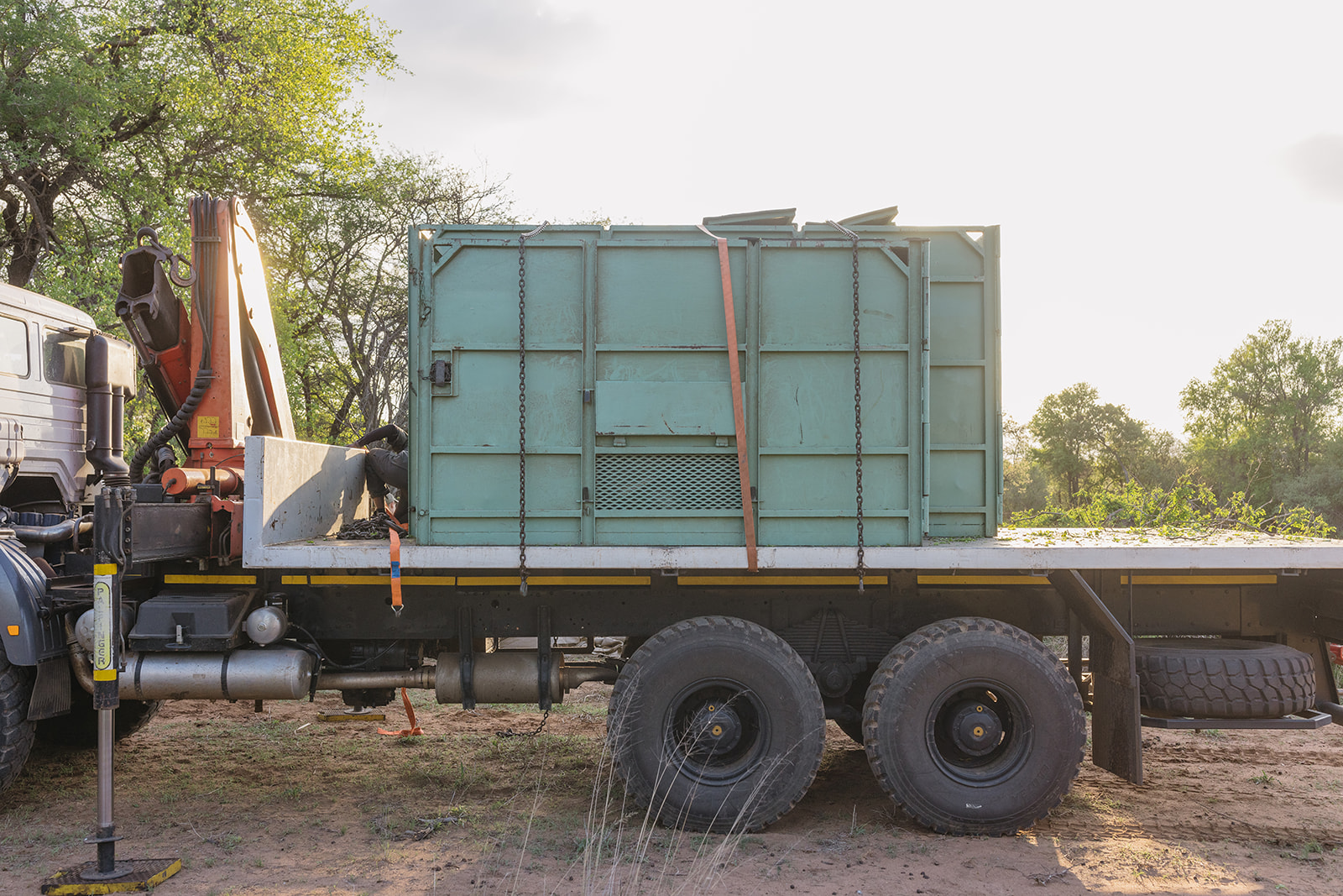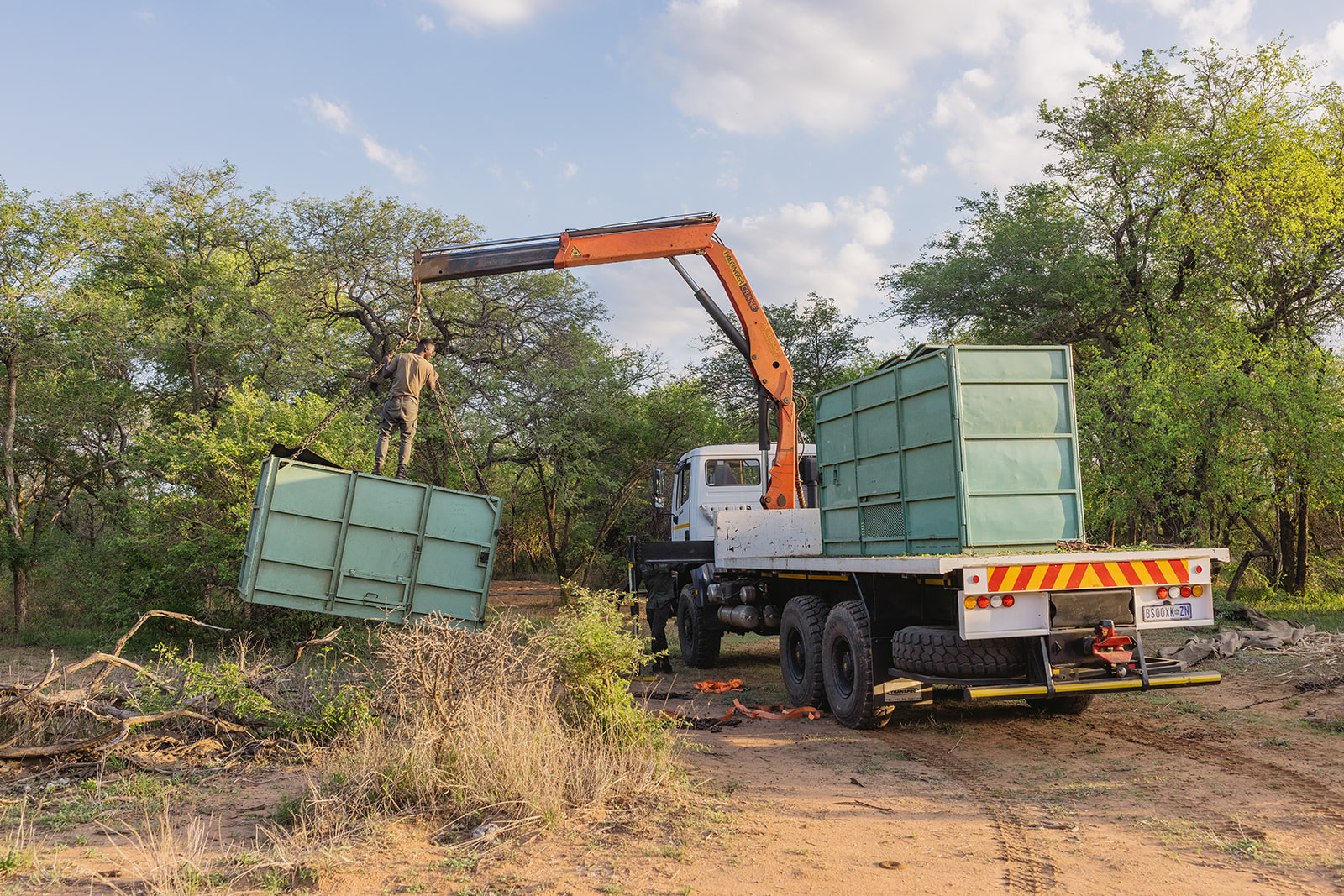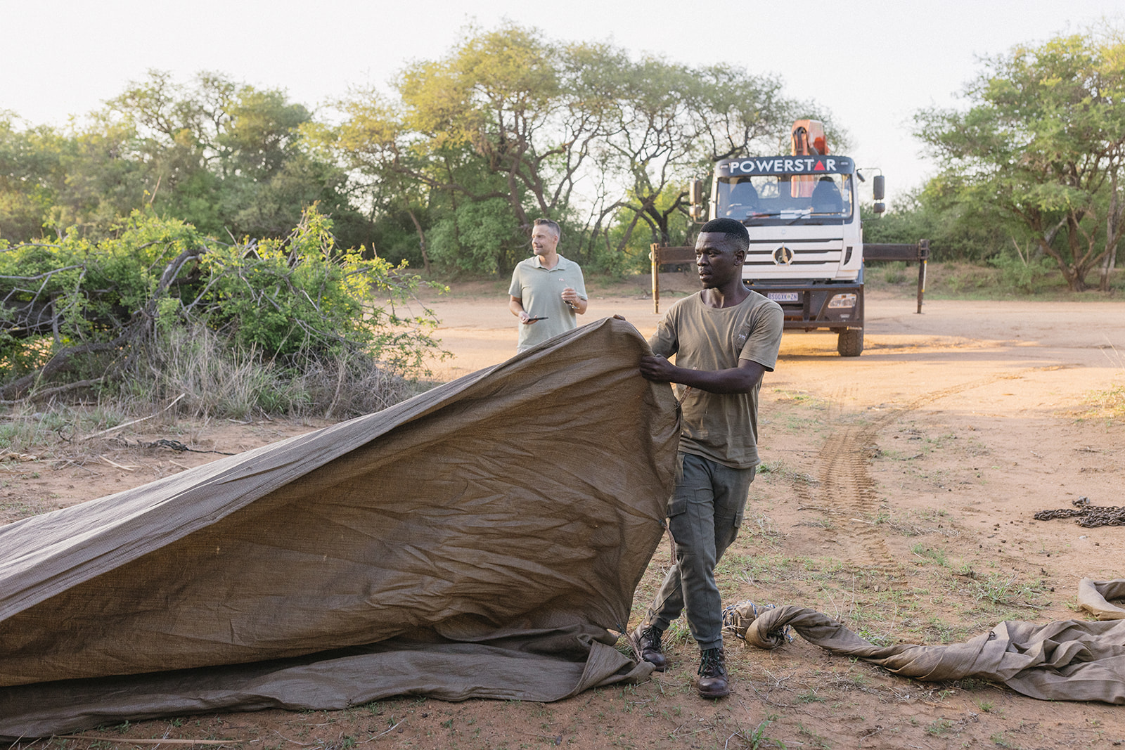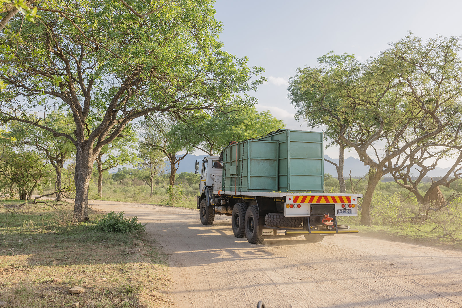 Nach einer mehrstündigen Fahrt erreichte der Transportkonvoi gegen 17 Uhr das Ziel. Das Team von Rhino Revolution hatte eine nahegelegene Wasserstelle als idealen Auswilderungsort vorbereitet, um den Tieren nach der Reise sofort Zugang zu Wasser und Futter zu ermöglichen. Damit Mutter und Kalb nicht getrennt werden, wurden die Transportboxen in einem vorübergehenden Gehege aus blickdichten Outdoorstoffen aufgestellt. Diese Maßnahme stellte sicher, dass die Tiere nach dem Verlassen der Box nicht in Panik in verschiedene Richtungen liefen.