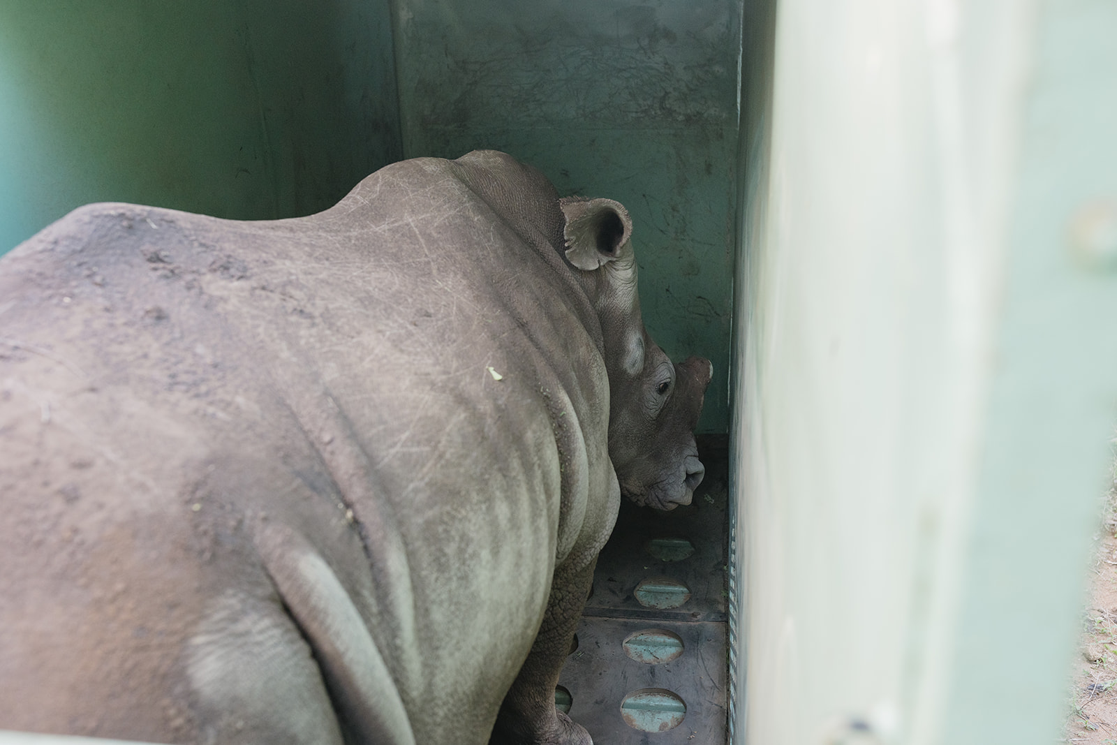 Nach der Verabreichung des Gegenmittels verließen die Nashörner energisch ihre Boxen. Wie erwartet waren die Tiere anfangs angespannt, beruhigten sich jedoch innerhalb weniger Minuten. Das Mutter-Kalb-Paar blieb eng beieinander – ein typisches Verhalten für Breitmaulnashörner – und begann vorsichtig, die neue Umgebung zu erkunden.